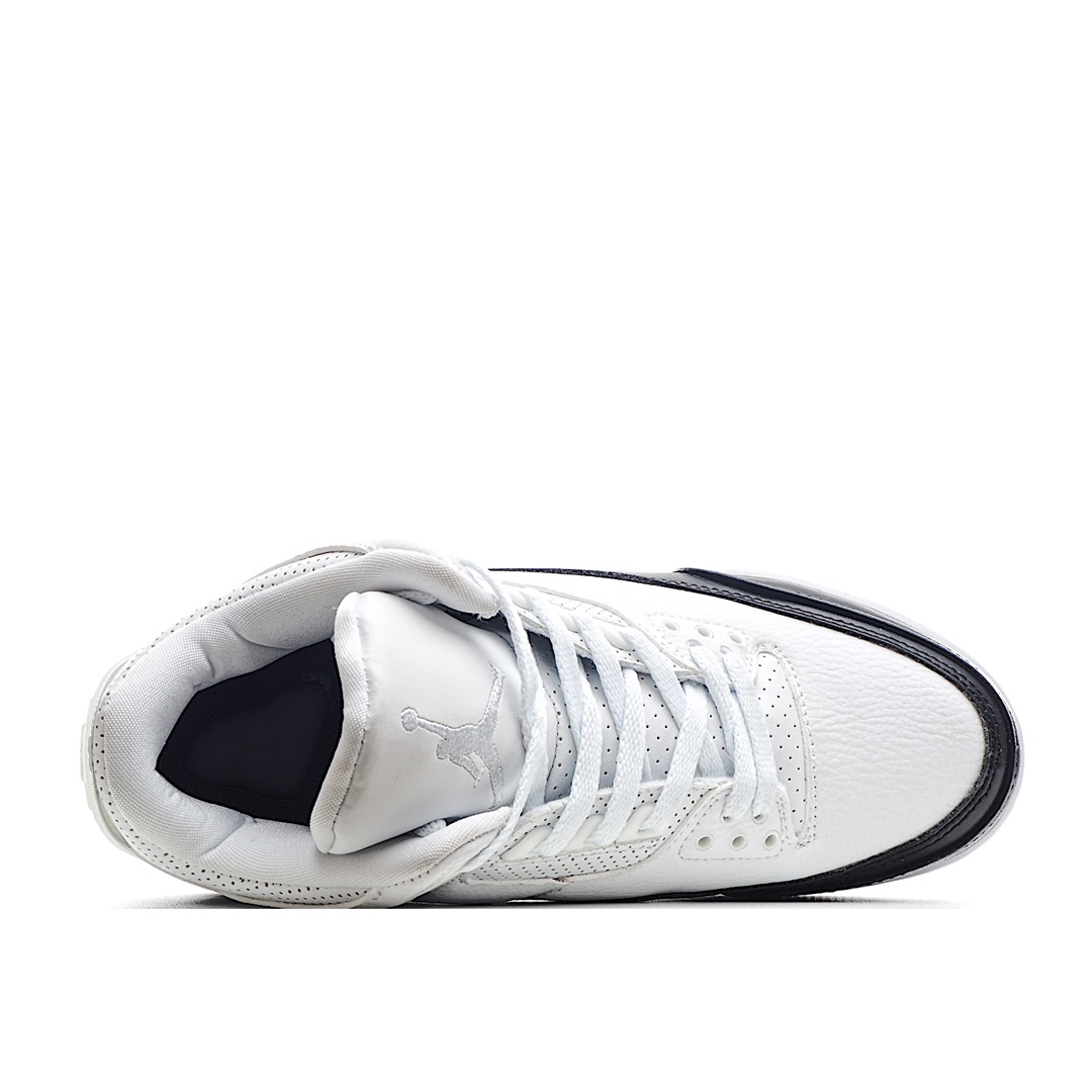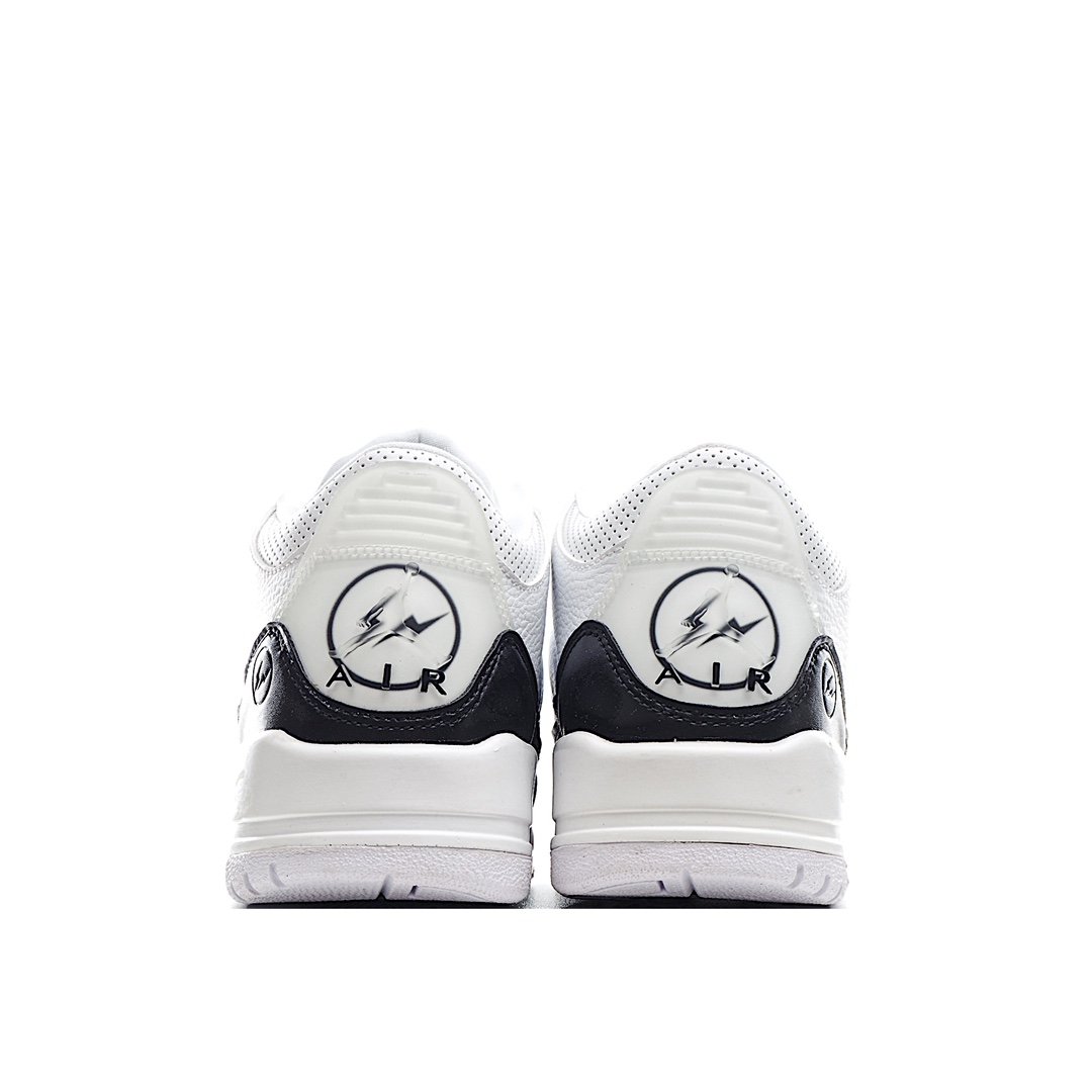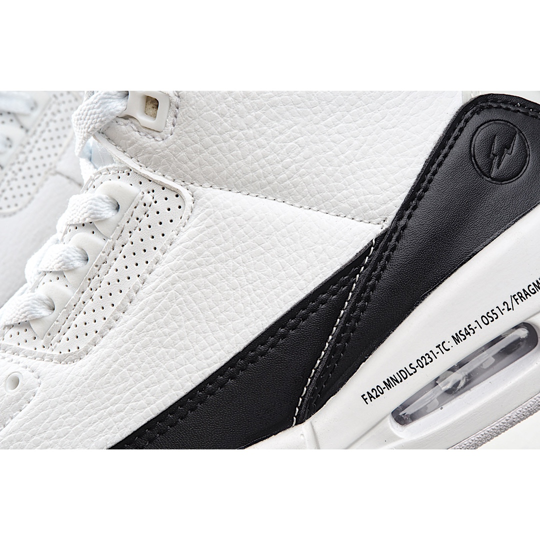 G5 Fragment Design x Air Jordan 3 AJ3 乔3 藤原浩 闪电联名 整双鞋以经典百搭的黑白主题呈现,鞋面使用质感极佳的皮革材质打造,白色鞋身搭配黑色包边,后跟部位压印有 Fragment Design 标志性的闪电 Logo。白色中底上印有黑色字符,鞋舌内侧同样缝有 “fragment” 标签,多处细节都彰显联名身份。最大亮点在后跟部位,透明的 Jumpman Logo 搭配黑色 “AIR” 字样,内层显现醒目的大闪电 Logo,“盖章” 位置更显眼,瞬间提升了整双鞋的辨识度。