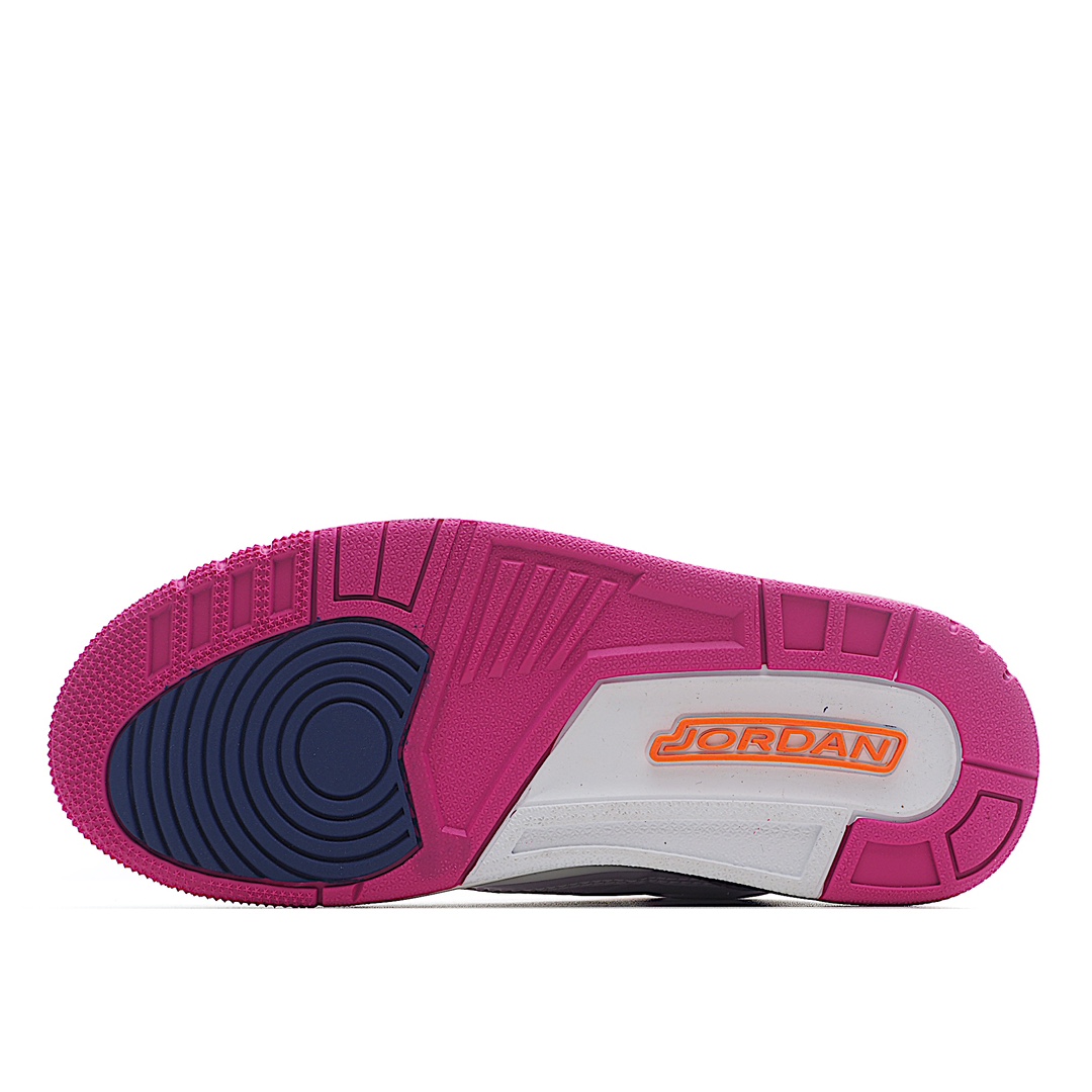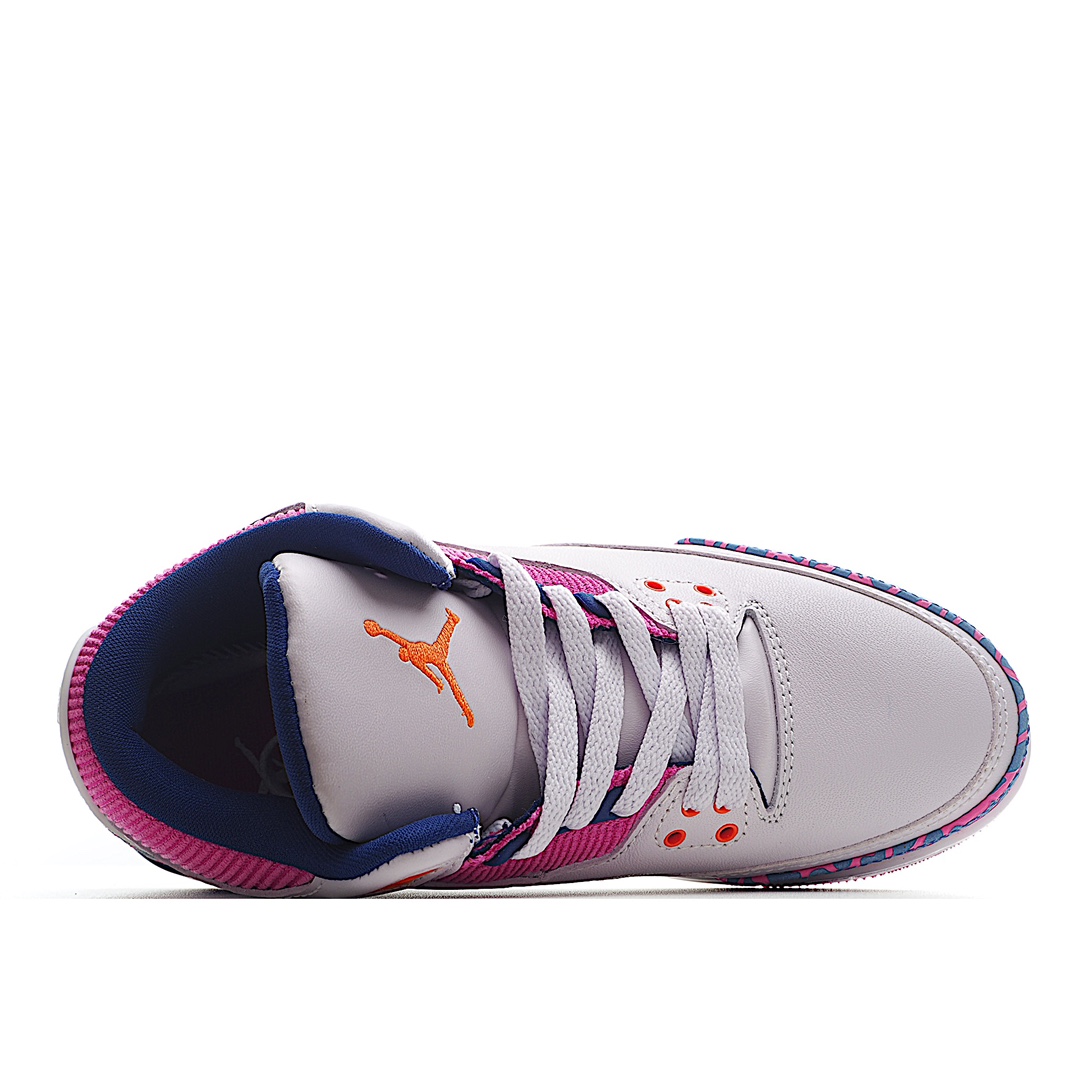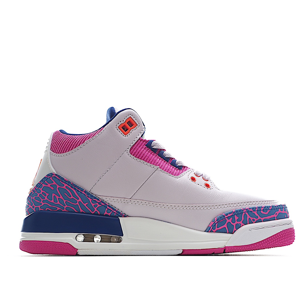 I0 中端之王 AJ3 爆裂纹粉紫色 Jordan Brand Air Jordan 3 GS。爆裂粉选用微葡萄紫色皮革搭配火焰粉色灯芯绒制作鞋身,鞋头以及后跟处辅以粉紫色爆裂纹装饰,细节处则有橙色点缀。