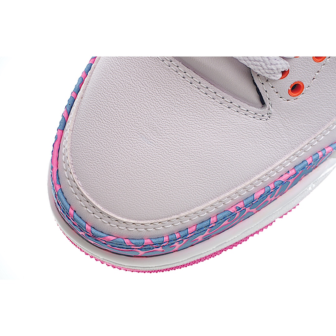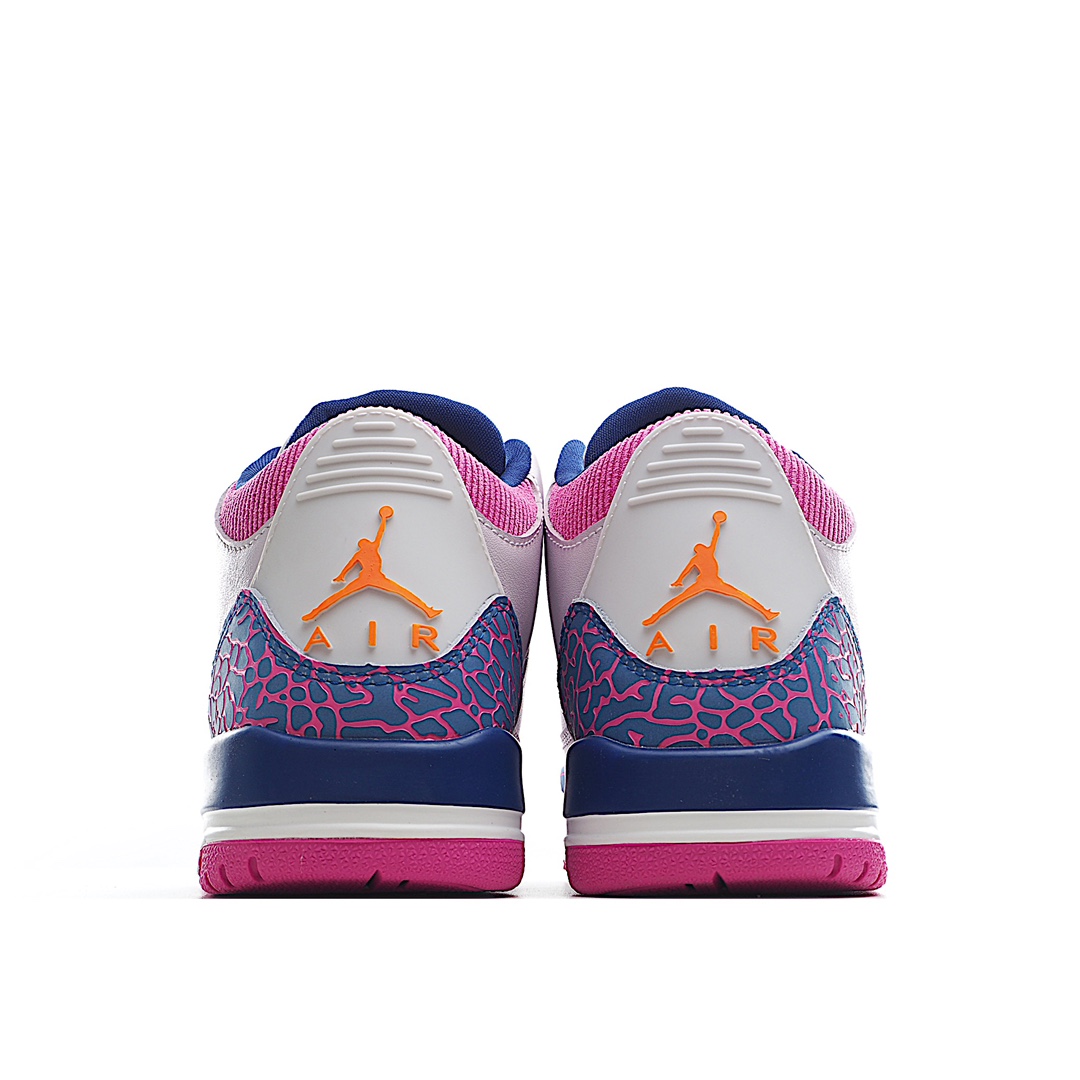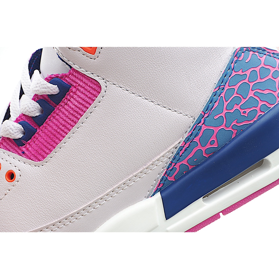 I0 中端之王 AJ3 爆裂纹粉紫色 Jordan Brand Air Jordan 3 GS。爆裂粉选用微葡萄紫色皮革搭配火焰粉色灯芯绒制作鞋身,鞋头以及后跟处辅以粉紫色爆裂纹装饰,细节处则有橙色点缀。