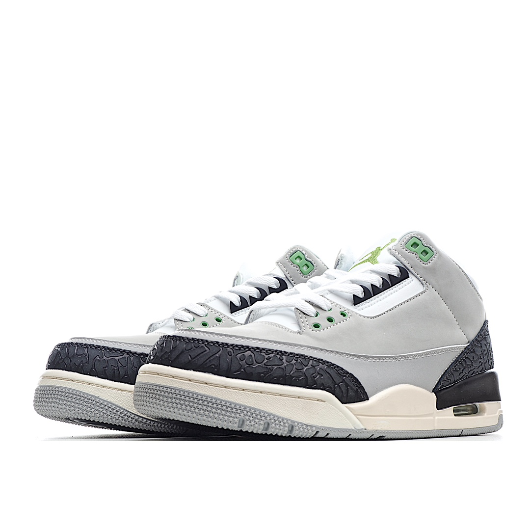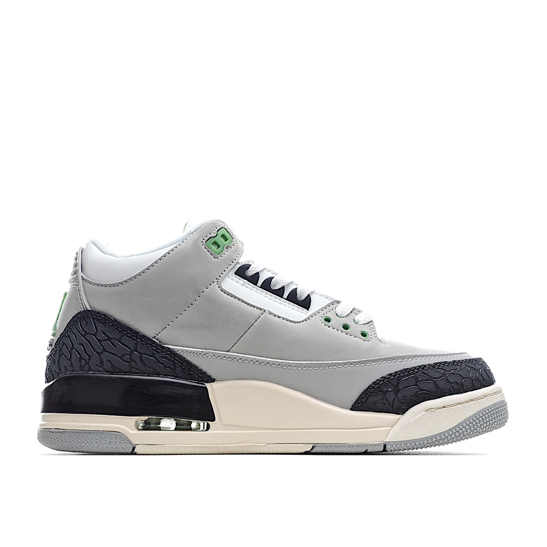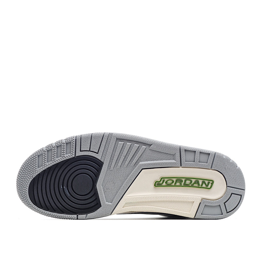 I0 Air Jordan 3 Retro“Chlorophyll” 叶绿素/灰绿手稿 中端之王配色灵感来自于 Nike Air Trainer 1,黑色爆裂纹搭配灰白拼色鞋面,鞋带扣和 Logo 都为 AJ 鞋款中罕见的绿色,展现出不同于以往配色的独特气质。配色新奇又低调百搭,是追求个性 AJ 迷的好选择。官方