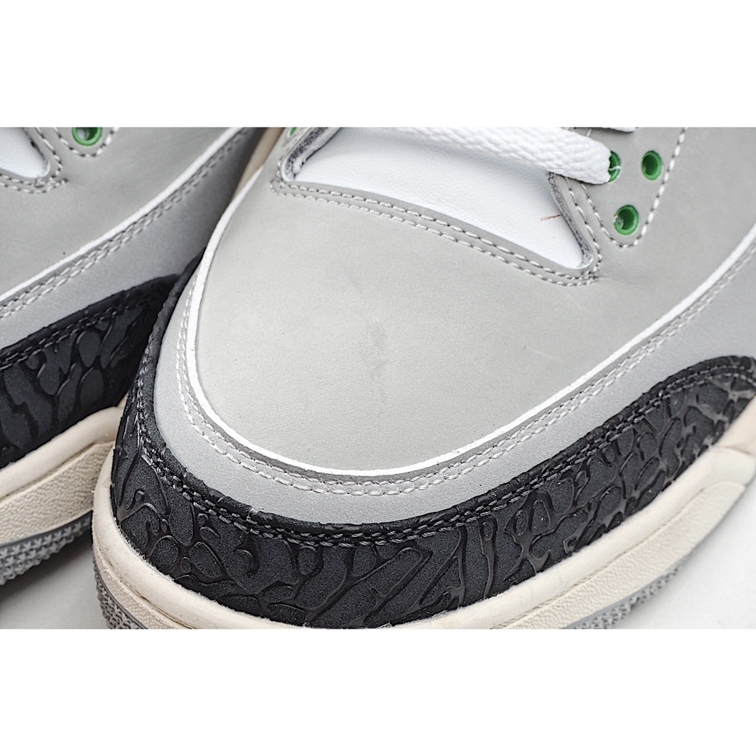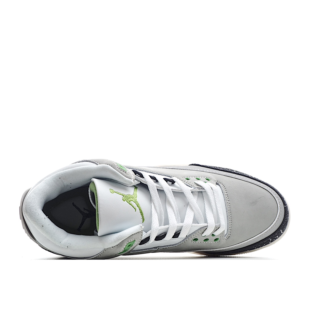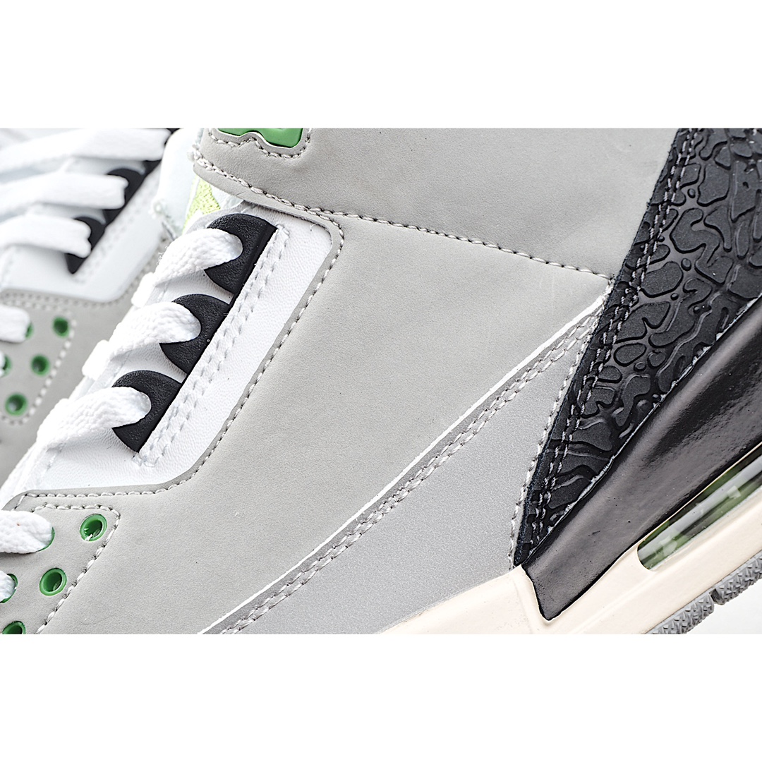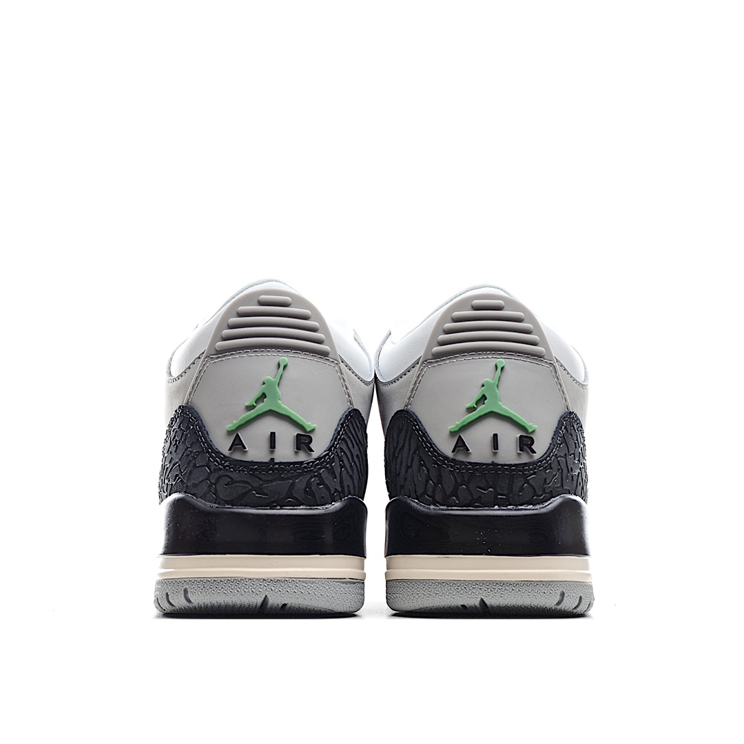 I0 Air Jordan 3 Retro“Chlorophyll” 叶绿素/灰绿手稿 中端之王配色灵感来自于 Nike Air Trainer 1,黑色爆裂纹搭配灰白拼色鞋面,鞋带扣和 Logo 都为 AJ 鞋款中罕见的绿色,展现出不同于以往配色的独特气质。配色新奇又低调百搭,是追求个性 AJ 迷的好选择。官方