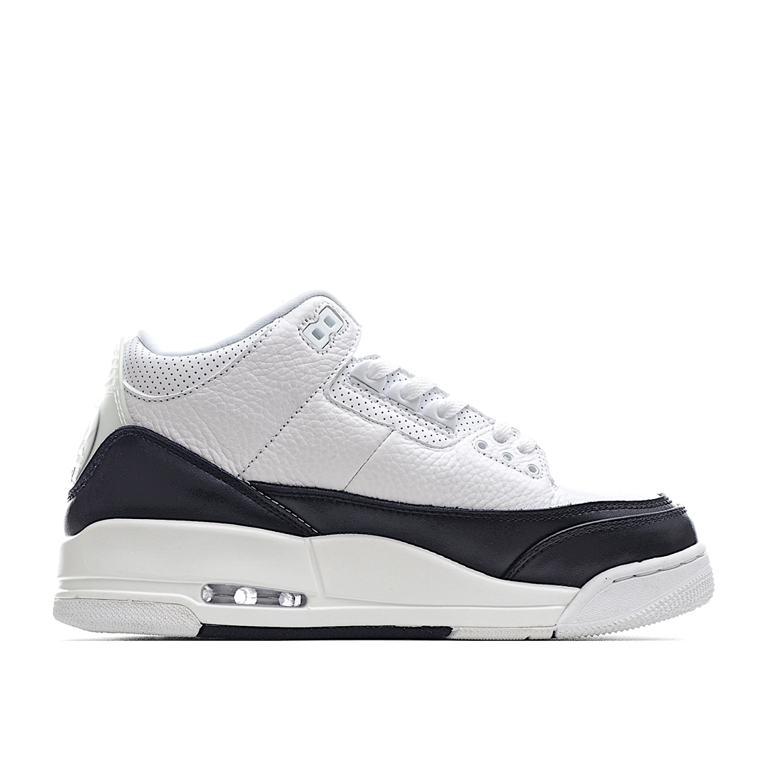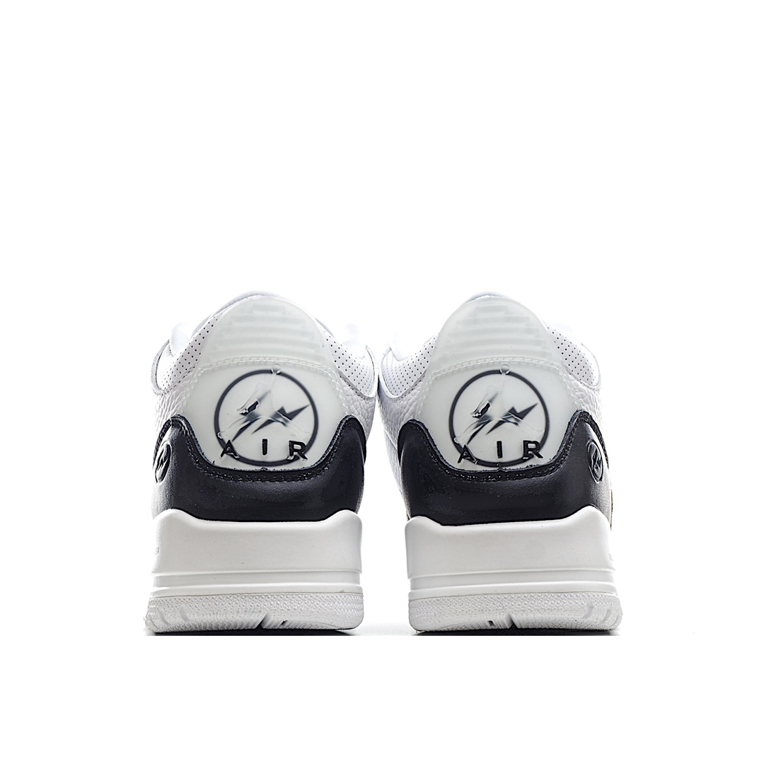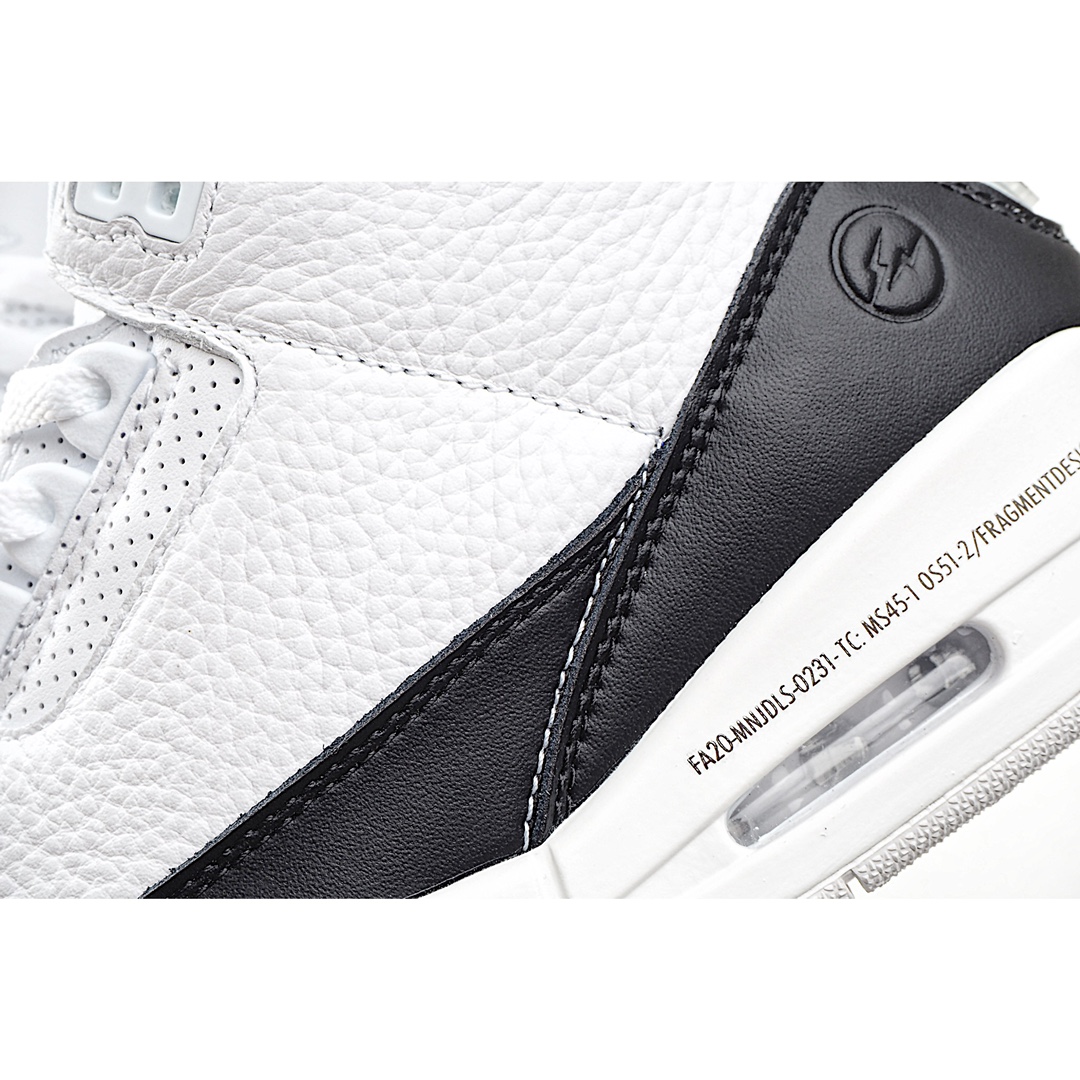 I0 Fragment Design x Air Jordan 3 AJ3 乔3 藤原浩 闪电联名 整双鞋以经典百搭的黑白主题呈现,鞋面使用质感极佳的皮革材质打造,白色鞋身搭配黑色包边,后跟部位压印有 Fragment Design 标志性的闪电 Logo。白色中底上印有黑色字符,鞋舌内侧同样缝有 “fragment” 标签,多处细节都彰显联名身份。最大亮点在后跟部位,透明的 Jumpman Logo 搭配黑色 “AIR” 字样,内层显现醒目的大闪电 Logo,“盖章” 位置更显眼,瞬间提升了整双鞋的辨识度。