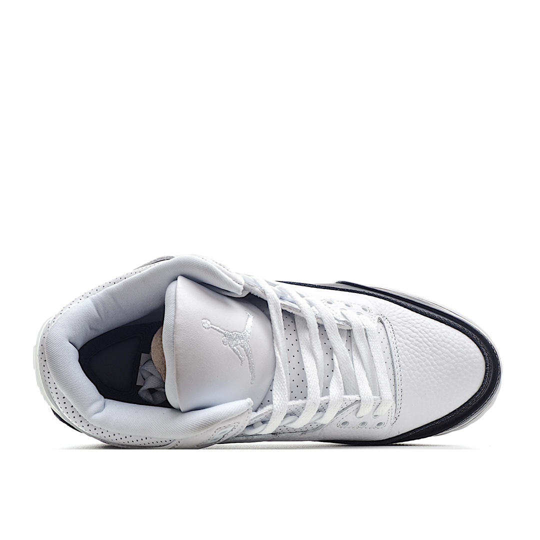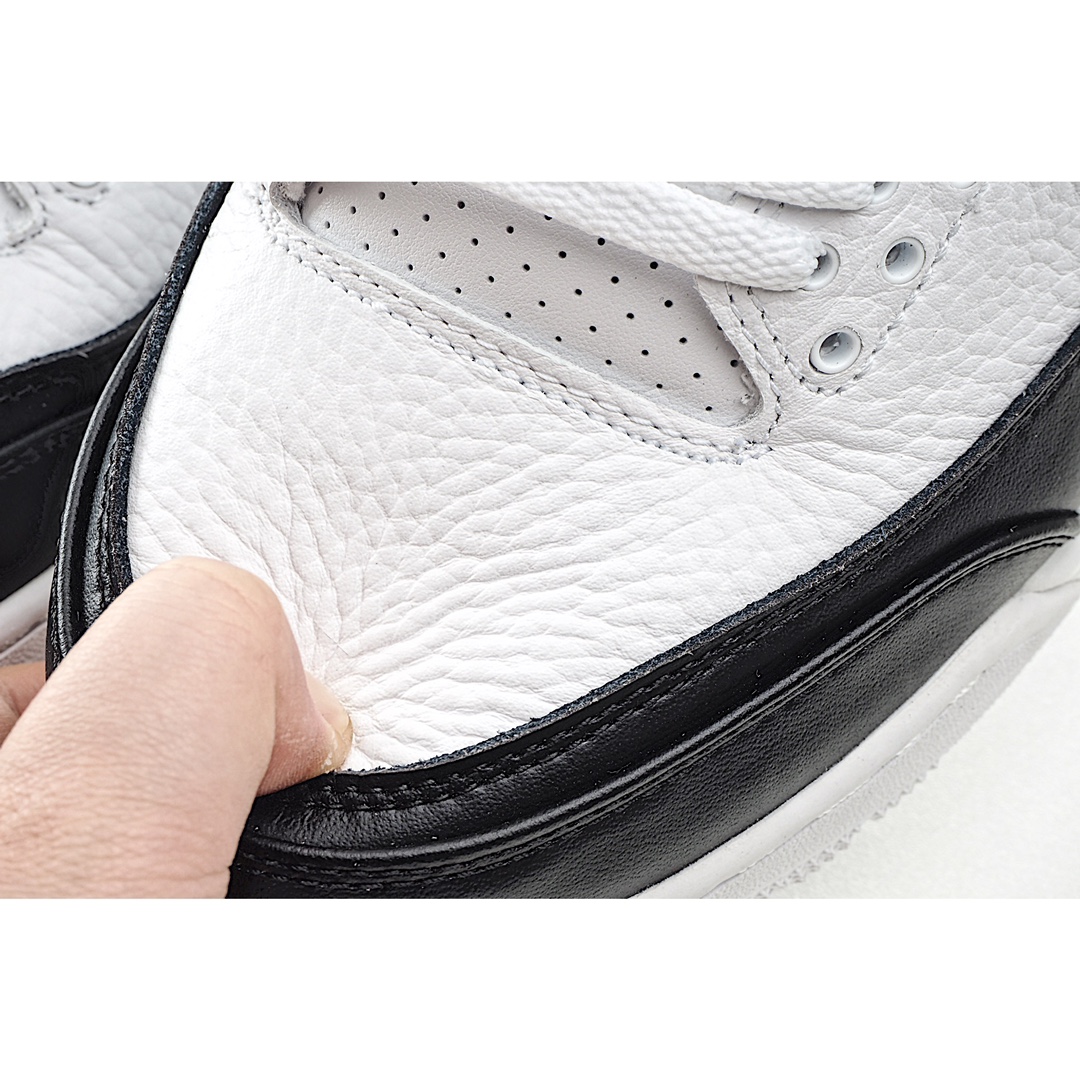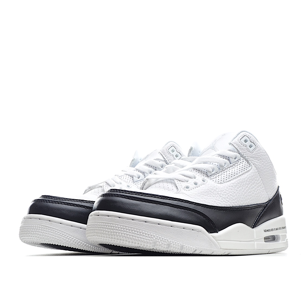 I0 Fragment Design x Air Jordan 3 AJ3 乔3 藤原浩 闪电联名 整双鞋以经典百搭的黑白主题呈现,鞋面使用质感极佳的皮革材质打造,白色鞋身搭配黑色包边,后跟部位压印有 Fragment Design 标志性的闪电 Logo。白色中底上印有黑色字符,鞋舌内侧同样缝有 “fragment” 标签,多处细节都彰显联名身份。最大亮点在后跟部位,透明的 Jumpman Logo 搭配黑色 “AIR” 字样,内层显现醒目的大闪电 Logo,“盖章” 位置更显眼,瞬间提升了整双鞋的辨识度。