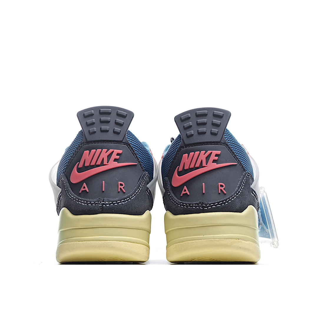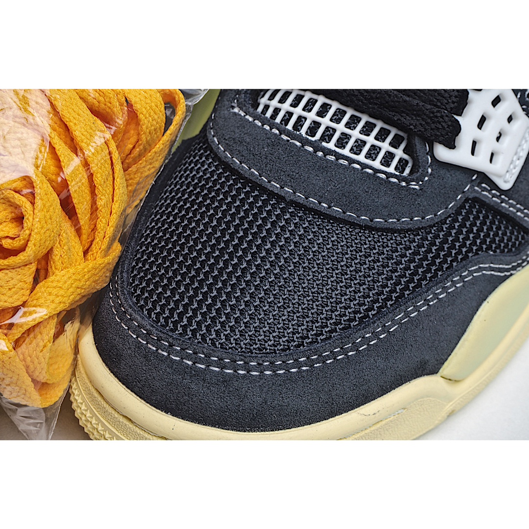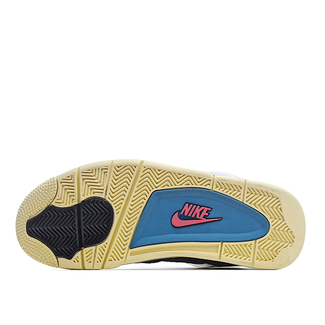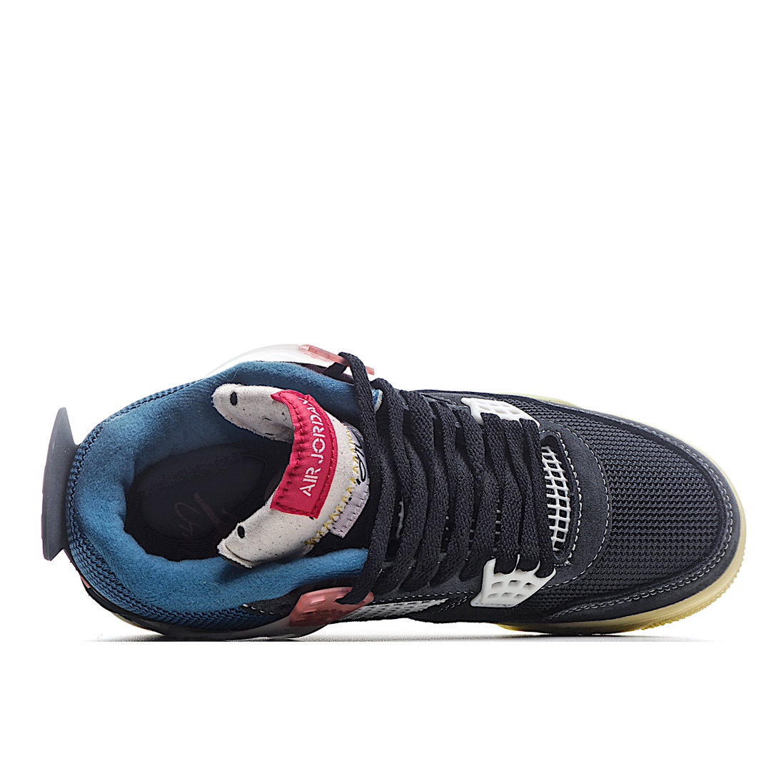 I0 Union x Nike Air Jordan 4 天价联名 黑蓝色 骑士篮球鞋 鞋身上经典的网格开窗部位缝有联名标签。鞋舌是最特别的细节之一,鞋舌长度变短并改为海绵材质,缝有 “AIR JORDAN” 字样。搭载自带氧化效果的黄色鞋底,后跟则是鲜艳夺目的 Nike Air 标志,遵从了 OG 元年的设计