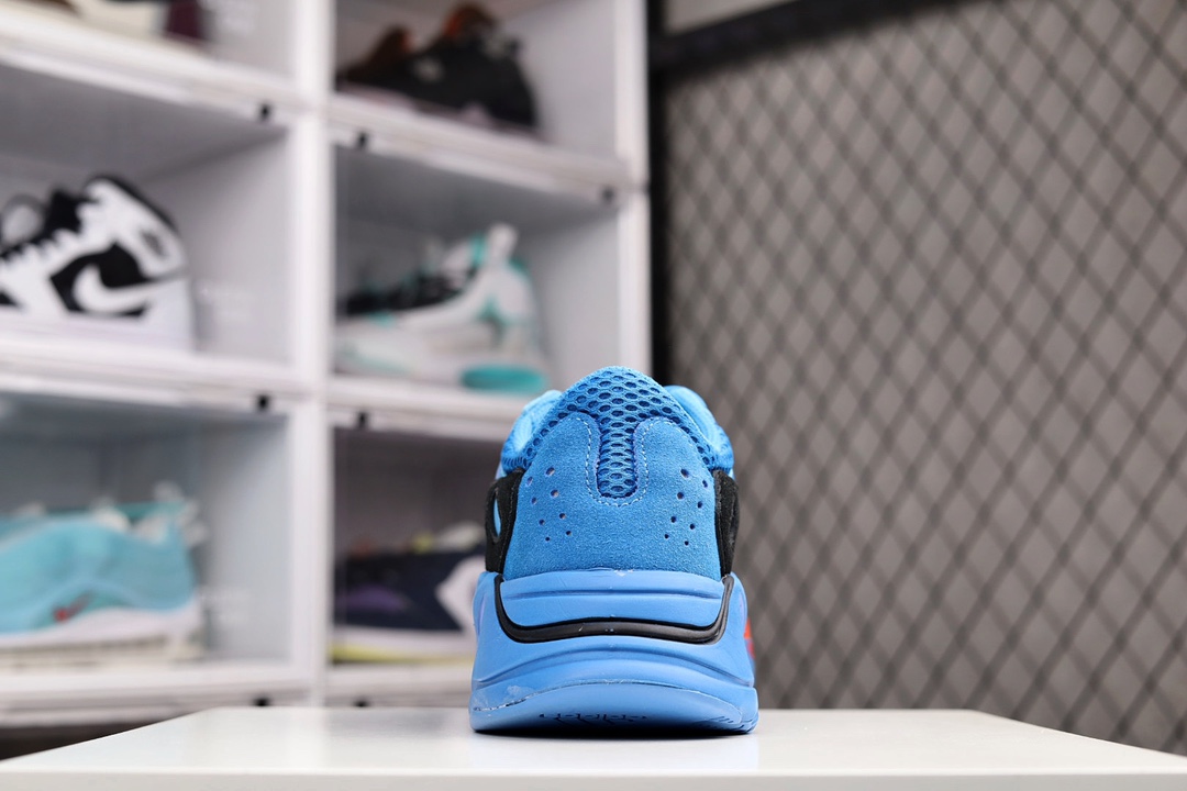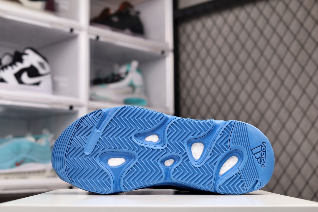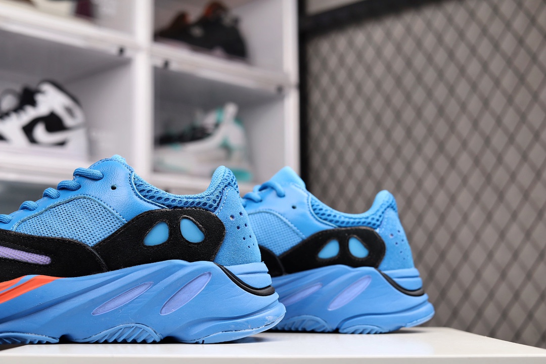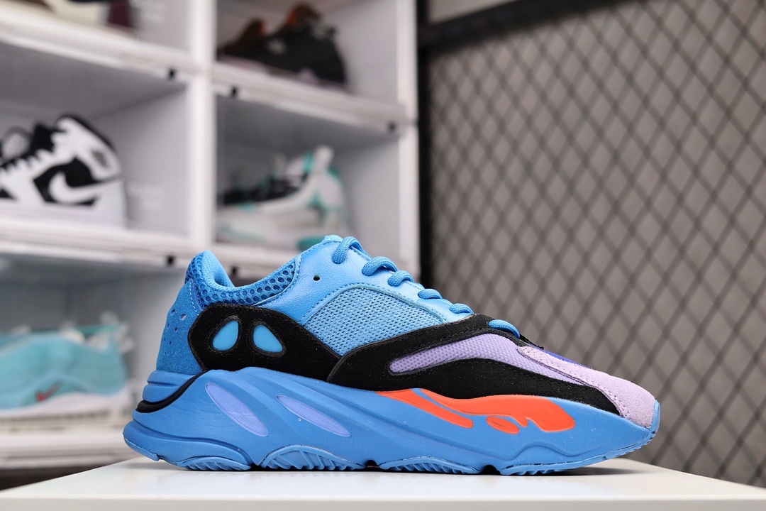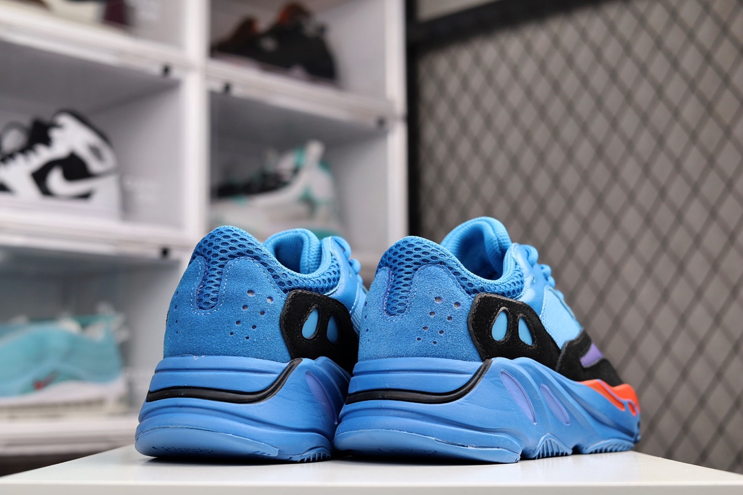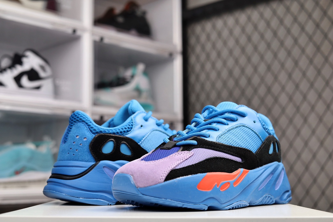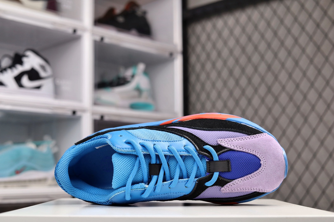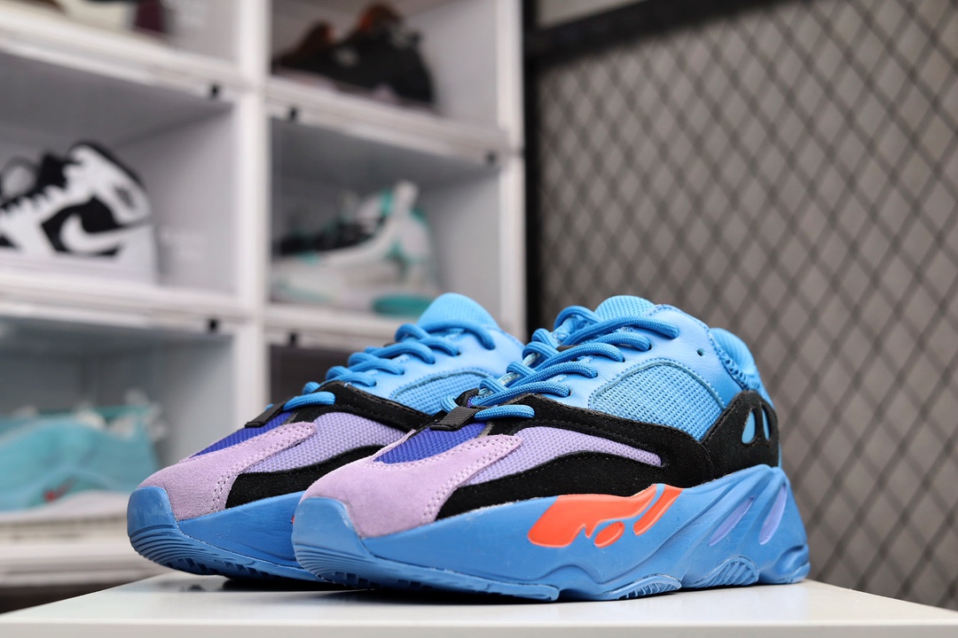 G0 真爆Ad Yeezy Boost 700 “Hi-Res Blue” HP6674 侃爷椰子 700 黑蓝紫配色跑鞋配色整体延续了 700系列经典的设计,鞋身采用了网眼、皮革和麂皮材质拼接打造,整体层次感十足。配色方面选用大面积蓝色为主色调,搭配黑色与紫色细节呈现。整体颜值十分亮眼。