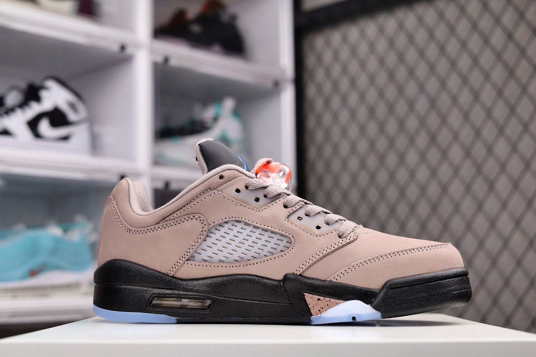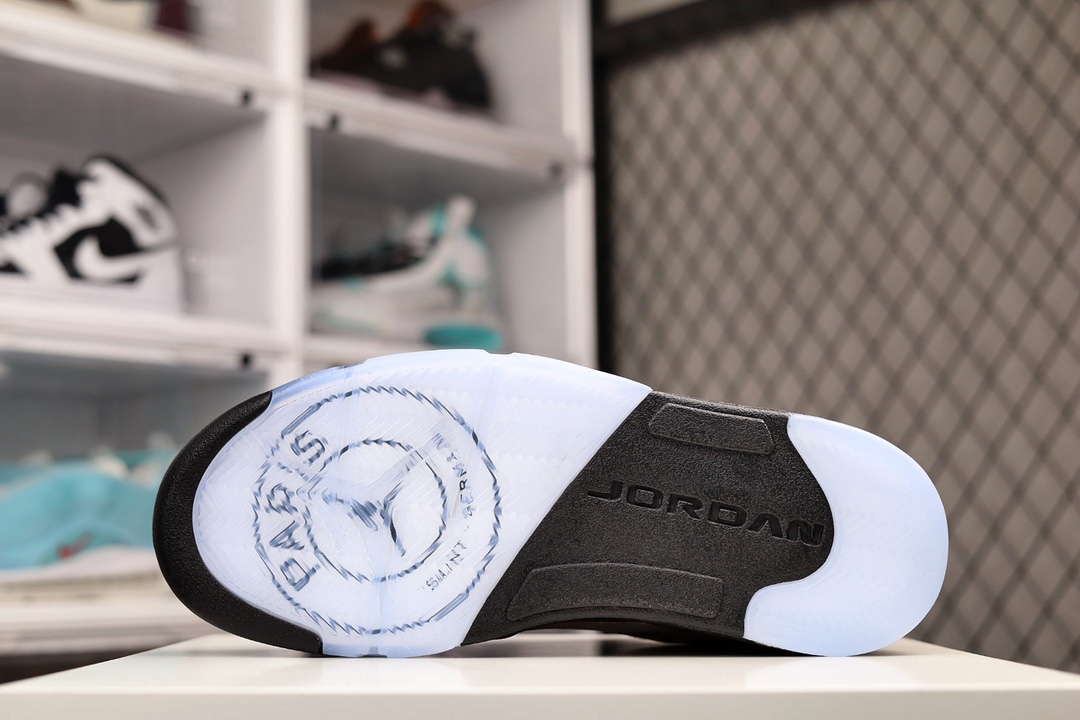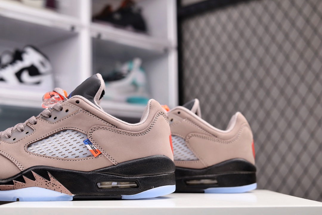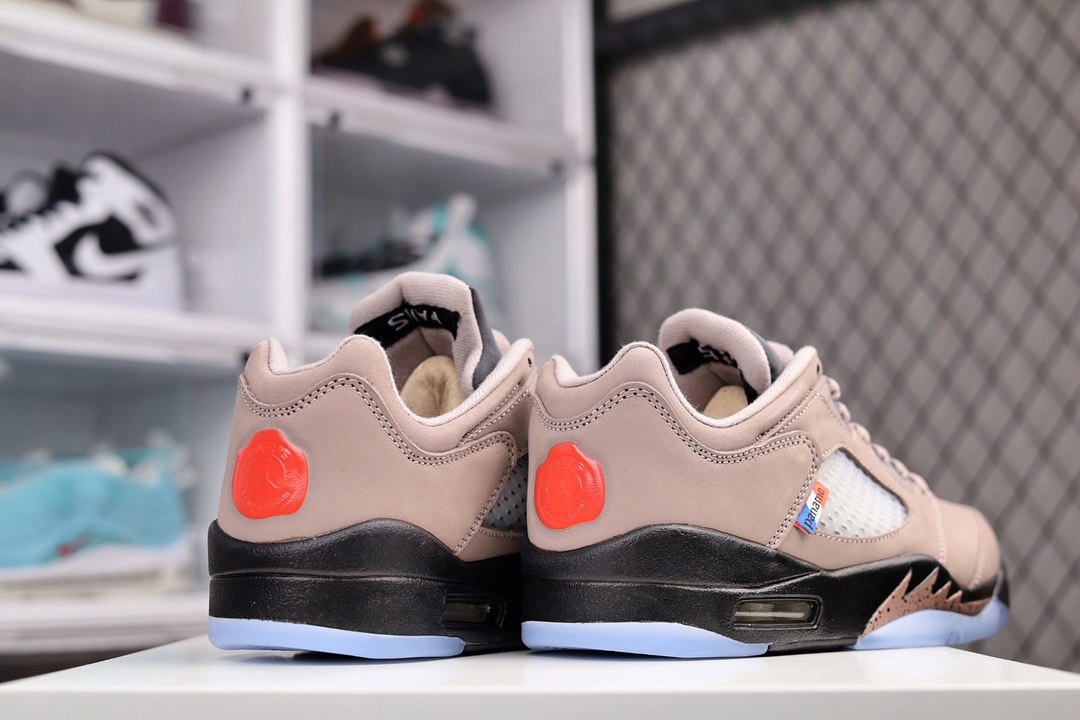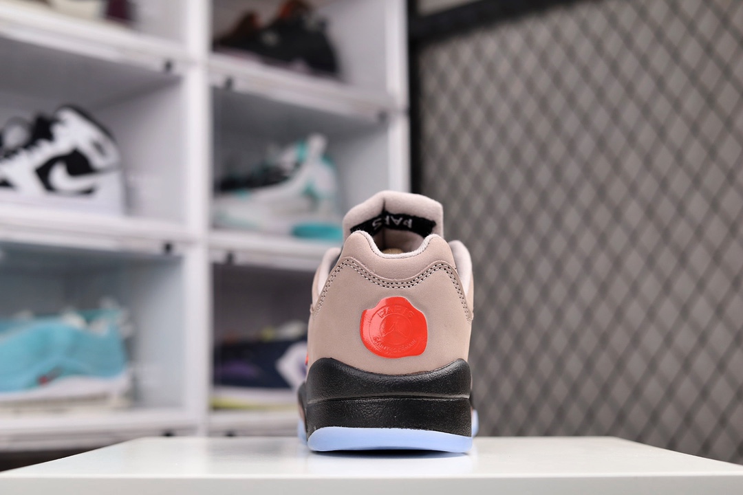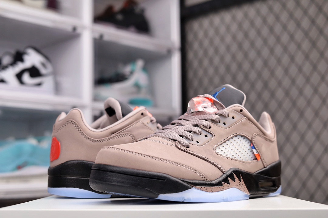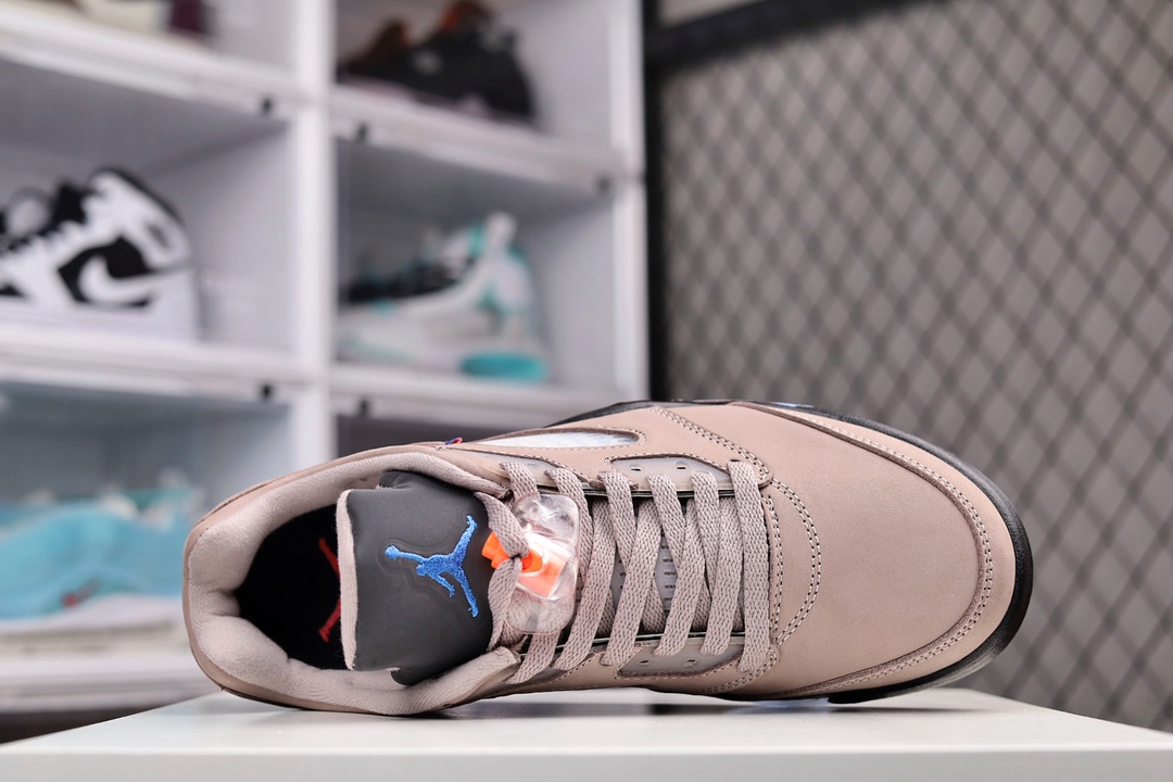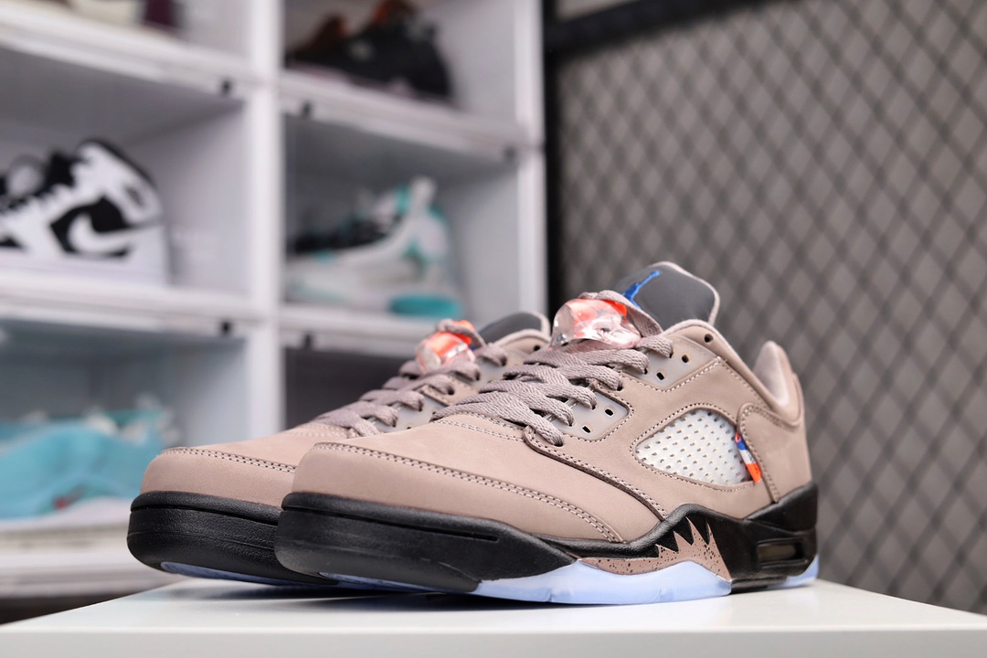 J0 大次 Air Jordan 5 Retro Low “PSG” 低帮 灰蓝大巴黎联名 AJ5 乔丹5代 aj5 乔5 低邦 灰银大巴黎 乔丹篮球鞋系列 鞋身整体以大面积灰色麂皮材质打造,据悉灵感来源于大巴黎22/23赛季球衣配色。整体颜值十分低调。此外鞋带扣部分使用了亮橙色点缀,鞋舌也采用了黑色设计,标志性的Jumpman Logo则使用蓝色缝线打造。透气网格侧面还带有”PANAME”字样标签。中底部分的标志性锯齿设计使用了银色呈现,并且上面带有黑色泼墨点缀。鞋底也使用黑色中底搭配水晶外底拼接设计。后跟则有一个独特的火漆印章,展现了PSG x Jordan Brand的联合标志,颇具辨识度。