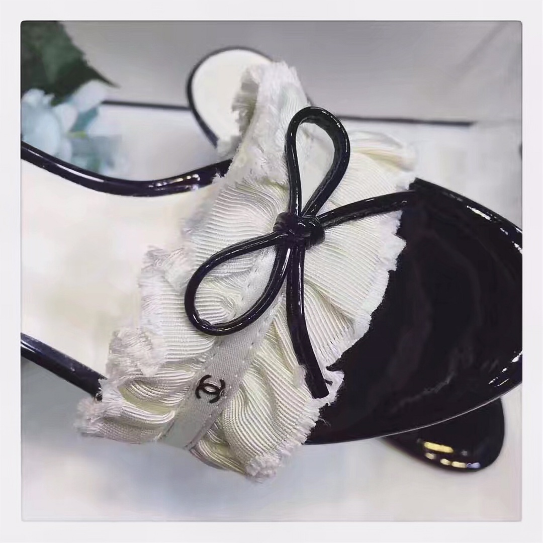 I0 、 Chanel 香奈儿凉拖鞋 鞋面压花蕾丝配精致蝴蝶结开模鞋跟羊皮内里 垫脚进口山羊皮 ,女人味十足鞋城订单款,做工精细橡胶底34-39,以出货,欢迎拿版实体进货2种跟高一个7CM、一个5CM