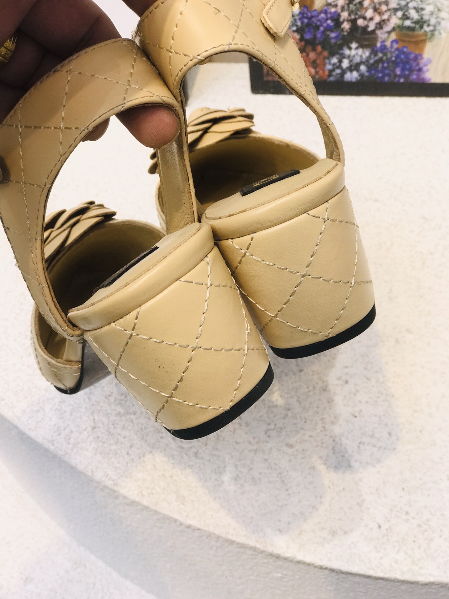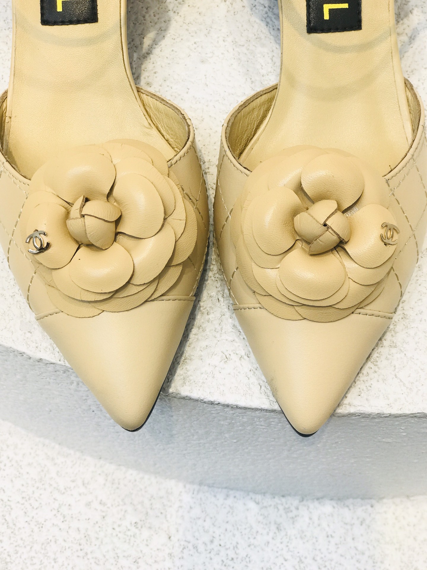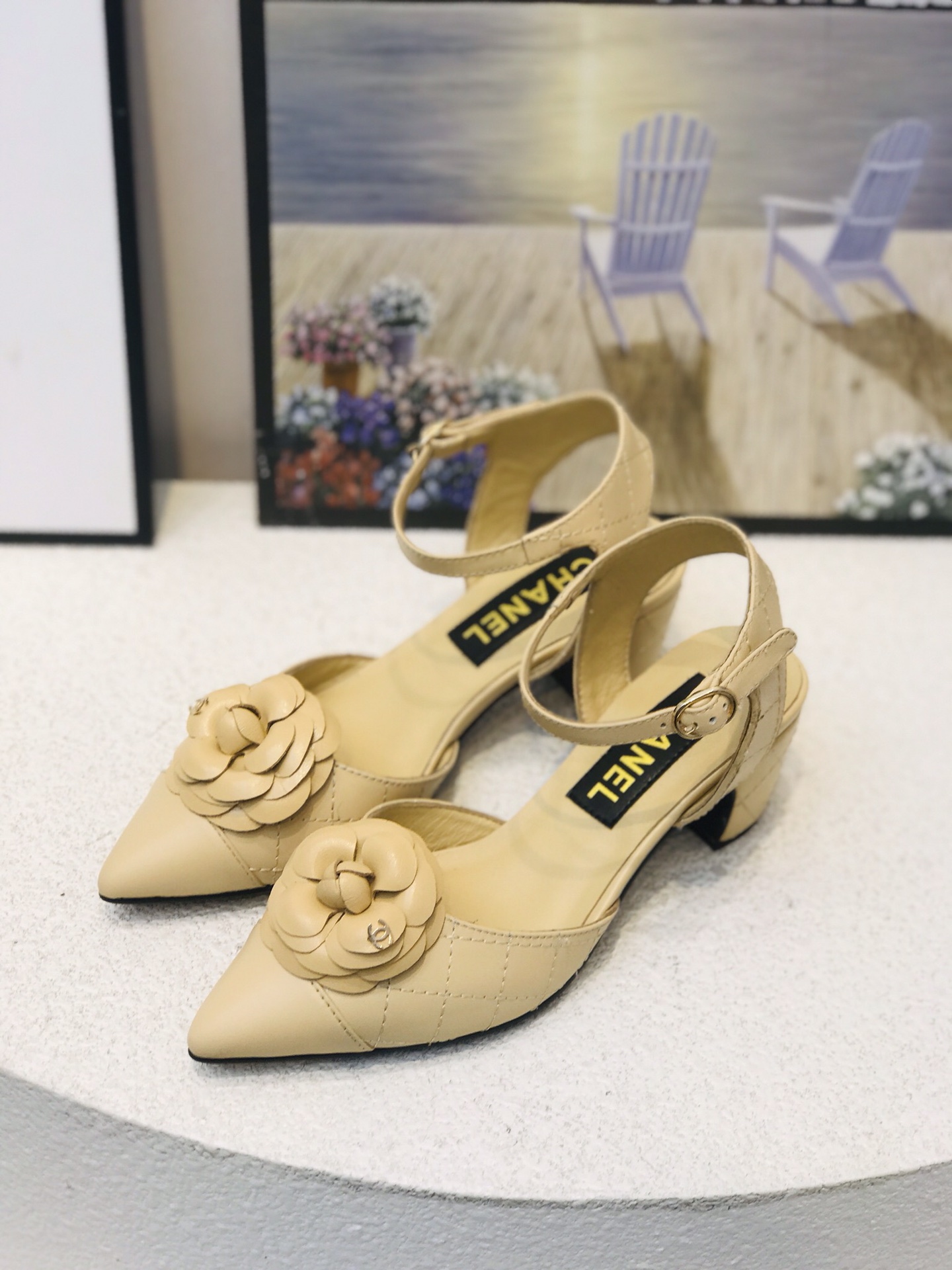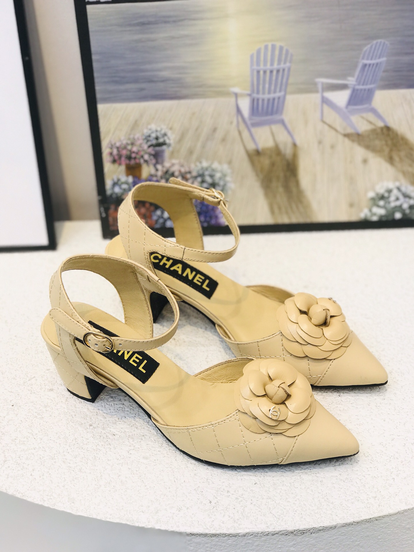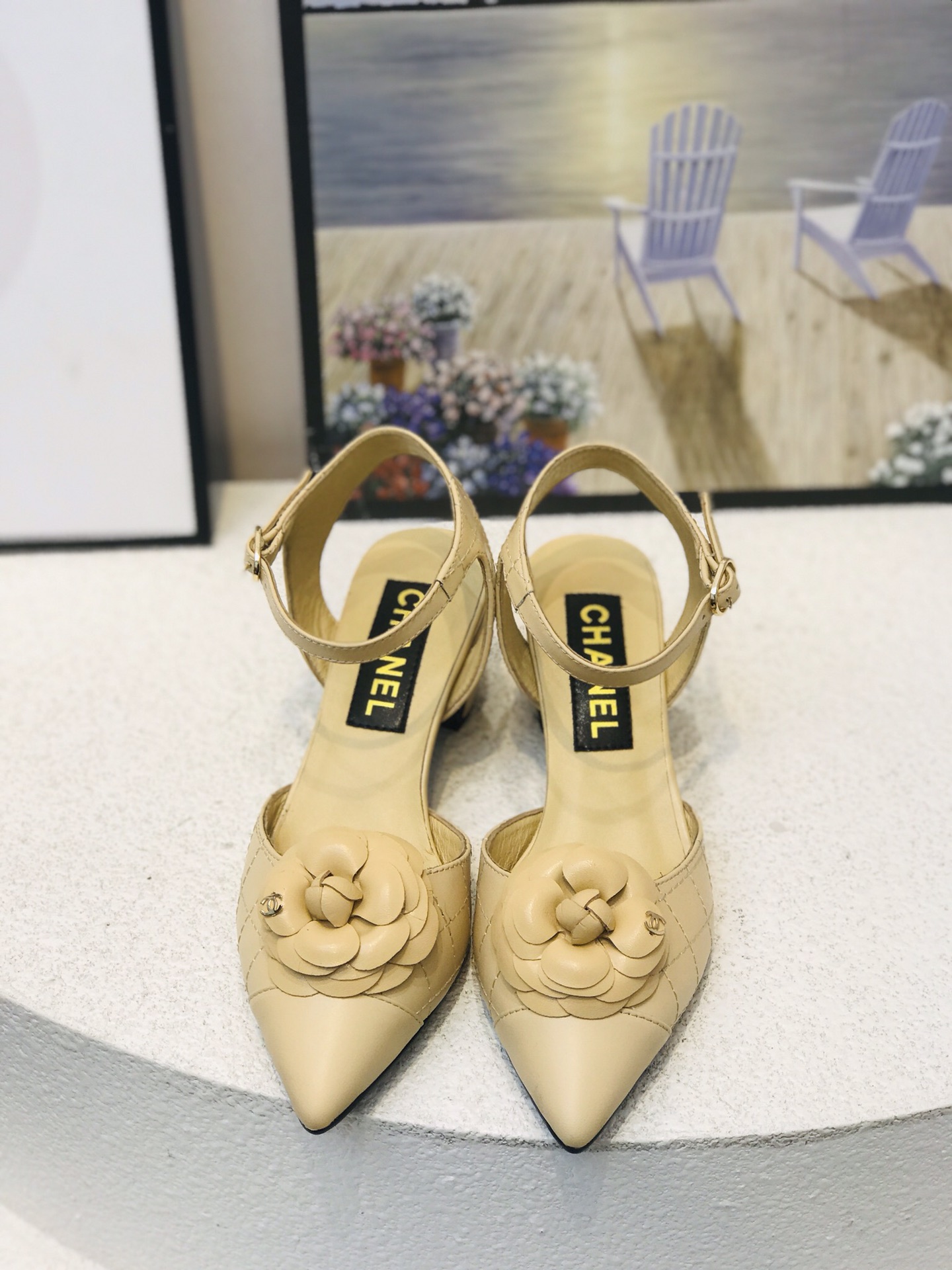 I0 最 Chanel 香奈儿格紋山茶花尖頭露跟鞋 黑,杏,两色可选 跟高:3厘米 鞋面:牛皮 内里:羊皮 橡胶大底 码数:35−41码