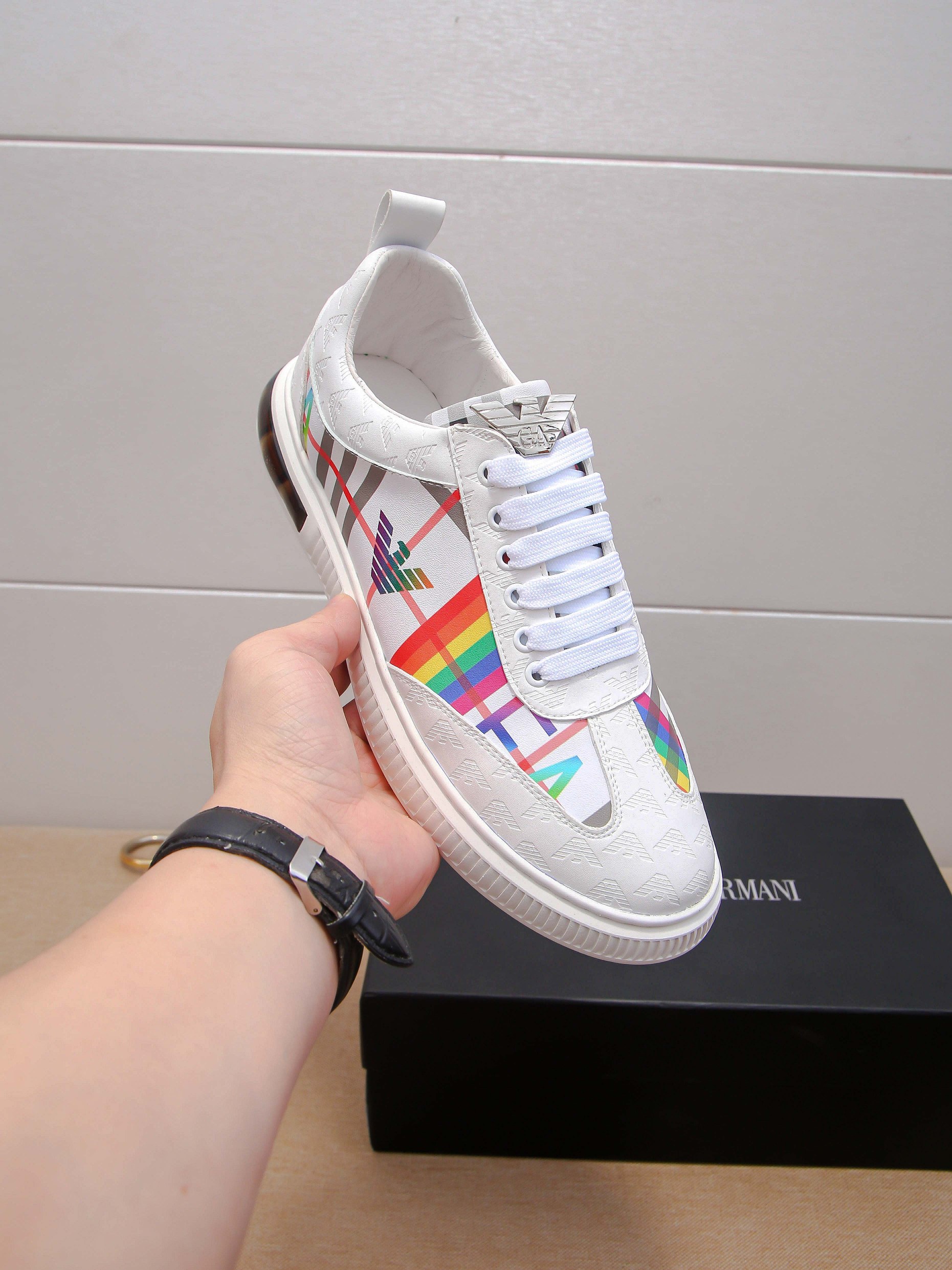 I0 阿玛尼最新爆款休闲鞋。按专柜款1:1制作,面料采用意大利进口牛皮➕羊皮内里。原版大底耐磨防滑。专柜级别版型,完美五金,完美上脚效果,车工精湛。