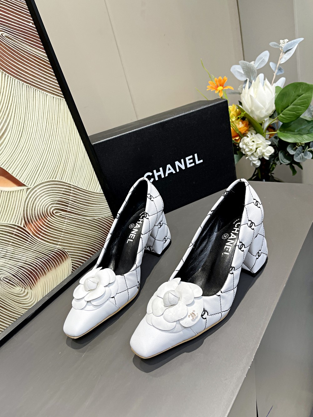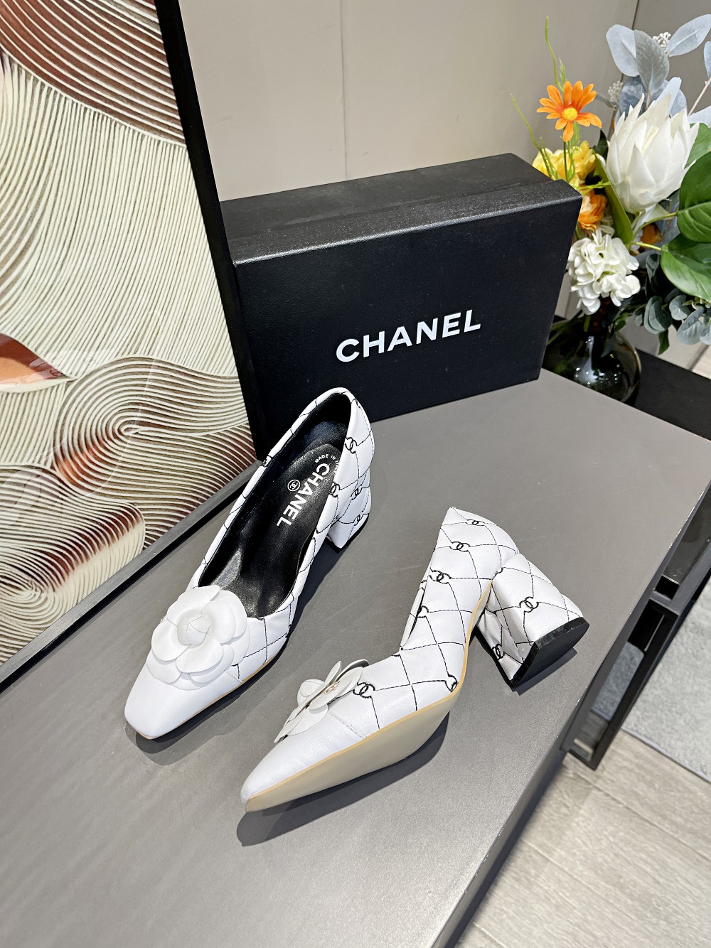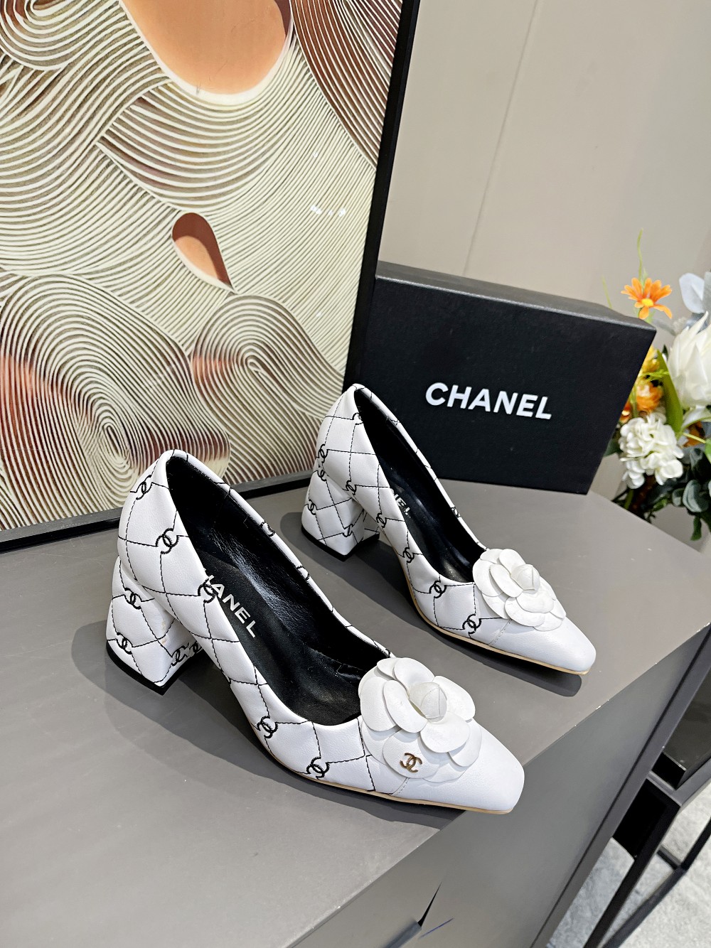 I0 Chanel 香奈儿开春CHANE小香家山茶花小方头拼色双C电绣单鞋,经典独特的山茶花,时尚够潮有气质,真正的一款美鞋,粗跟主要是走路平稳不累脚跟高6.5cm⚠面料:小牛皮,羊皮里,牛皮垫脚,码数;35-4034、41订做不退换