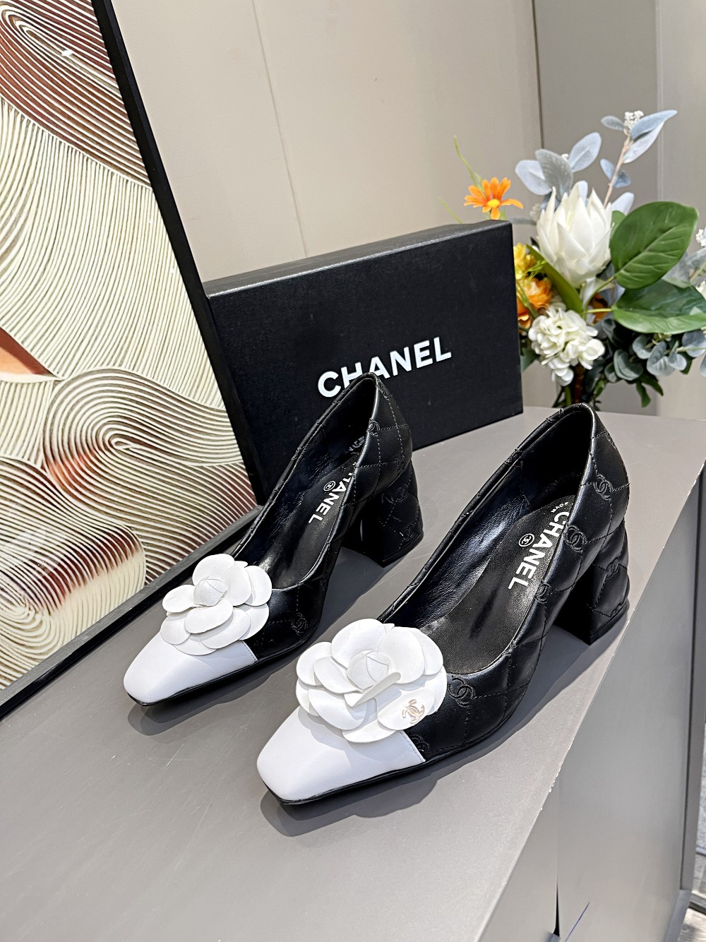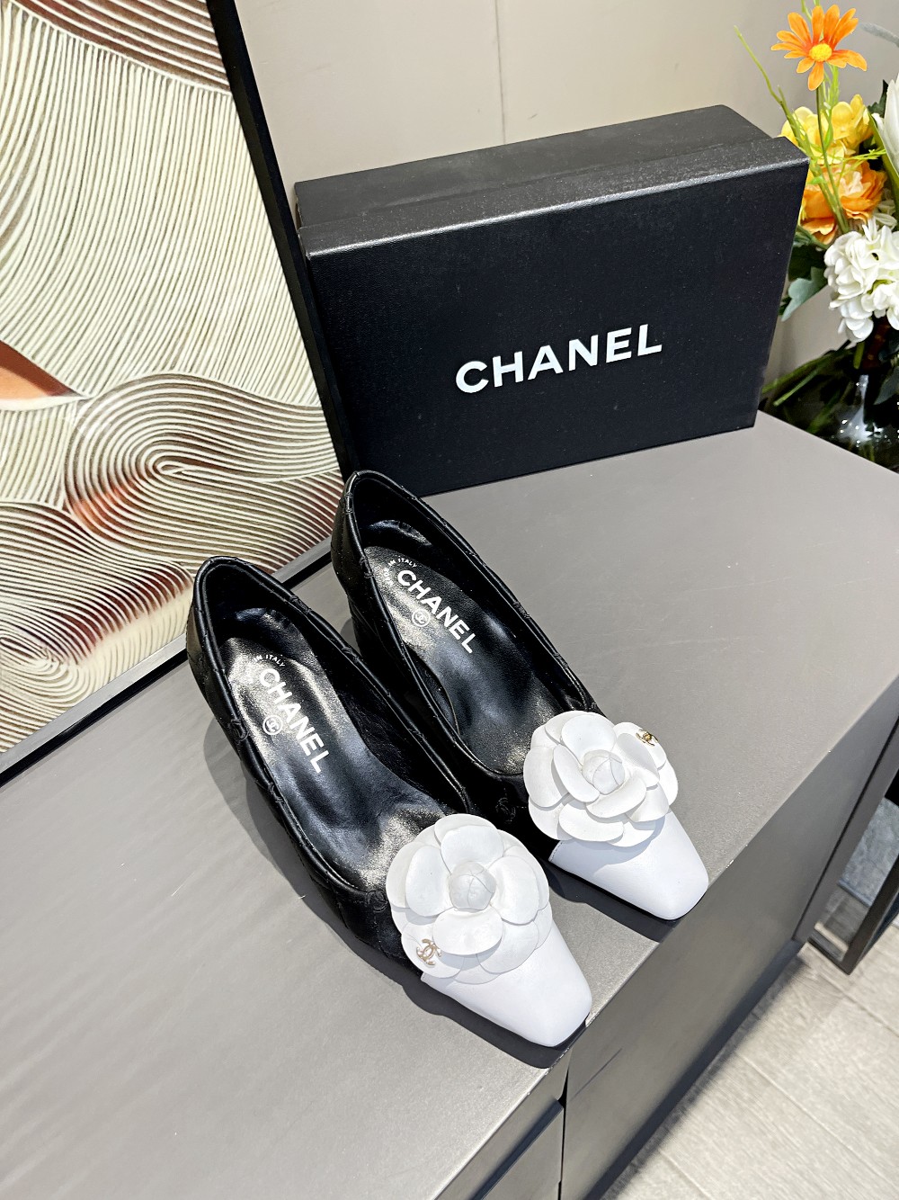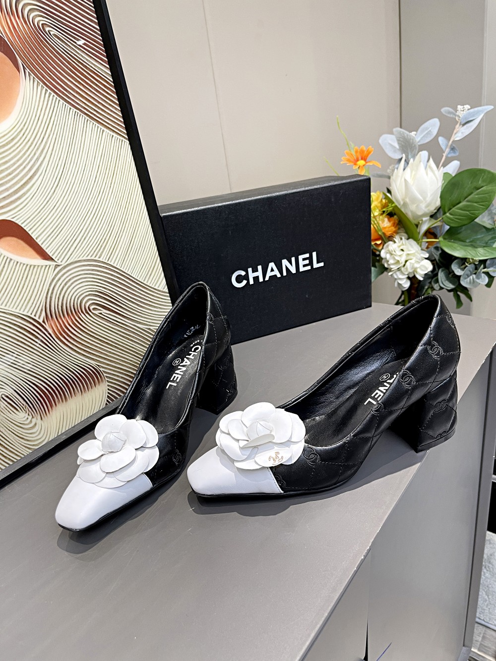 I5 2022开春香奈儿CHANE小香家山茶花小方头拼色双C电绣单鞋,经典独特的山茶花,时尚够潮有气质,真正的一款美鞋,粗跟主要是走路平稳不累脚跟高6.5cm⚠面料:小牛皮,羊皮里,牛皮垫脚,