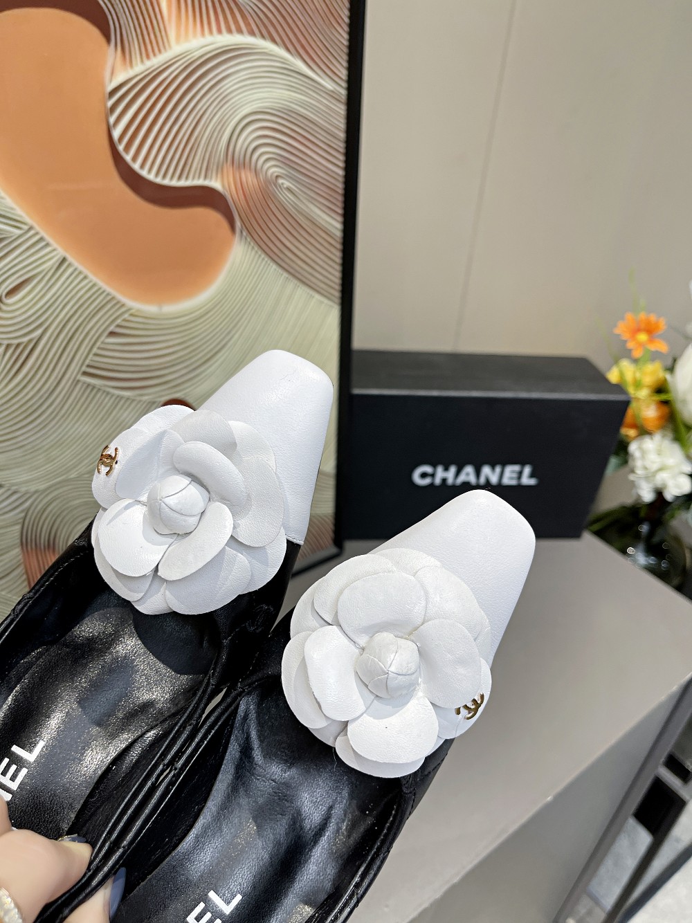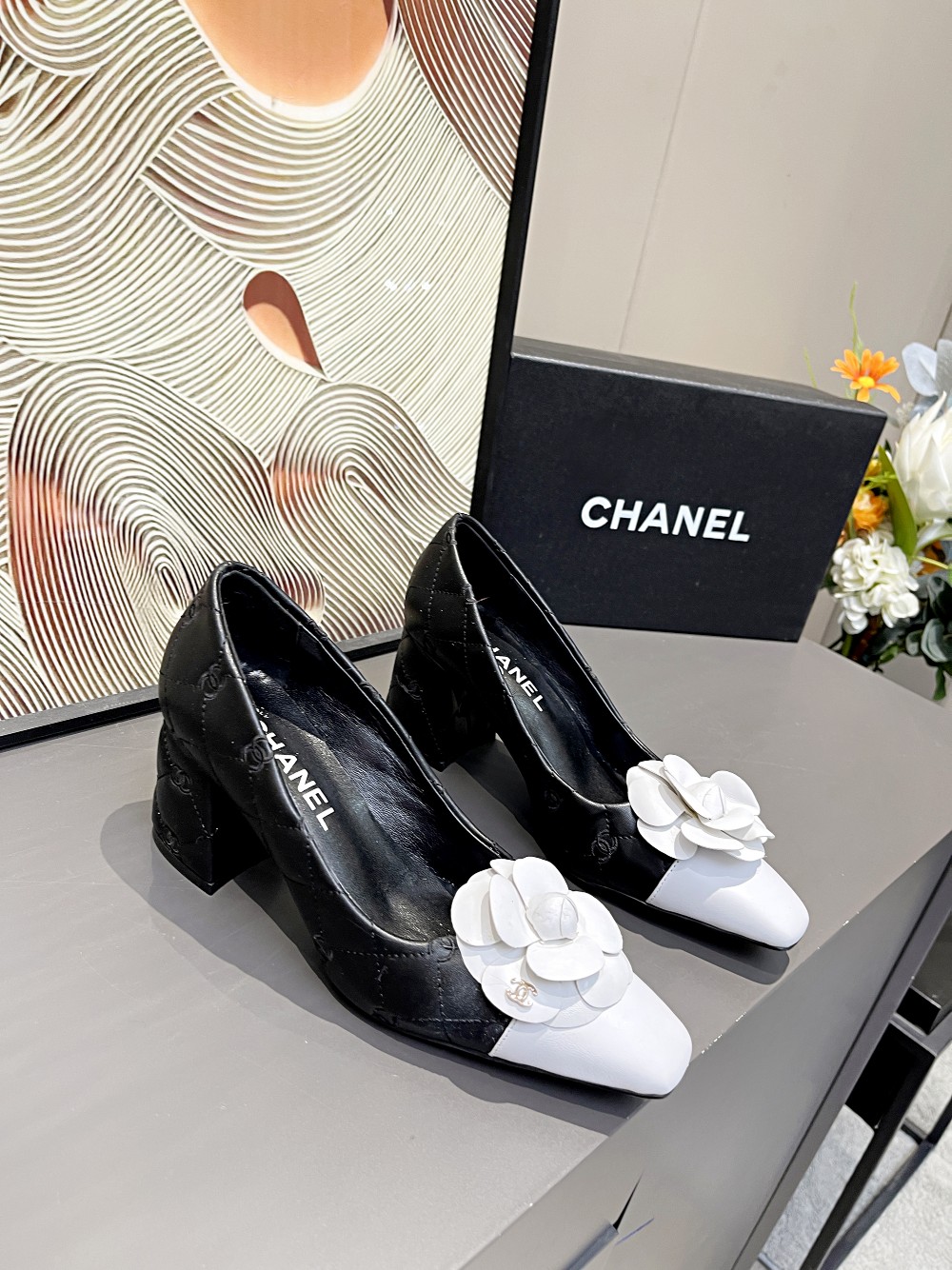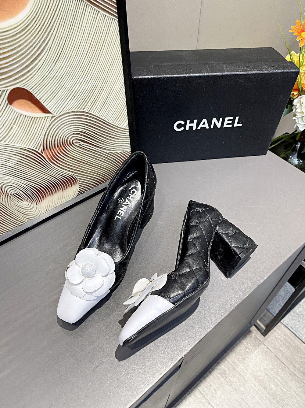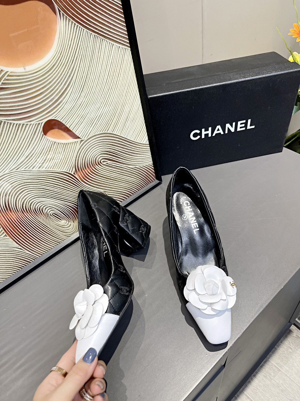 I5 2022开春香奈儿CHANE小香家山茶花小方头拼色双C电绣单鞋,经典独特的山茶花,时尚够潮有气质,真正的一款美鞋,粗跟主要是走路平稳不累脚跟高6.5cm⚠面料:小牛皮,羊皮里,牛皮垫脚,