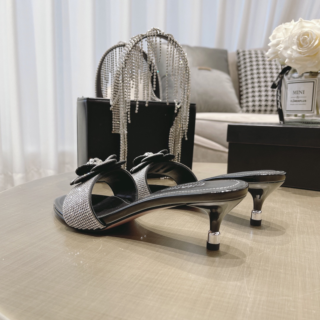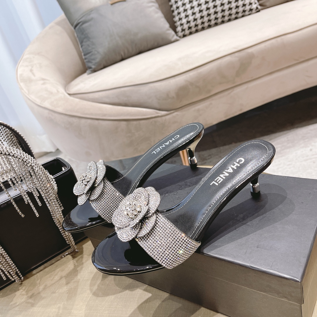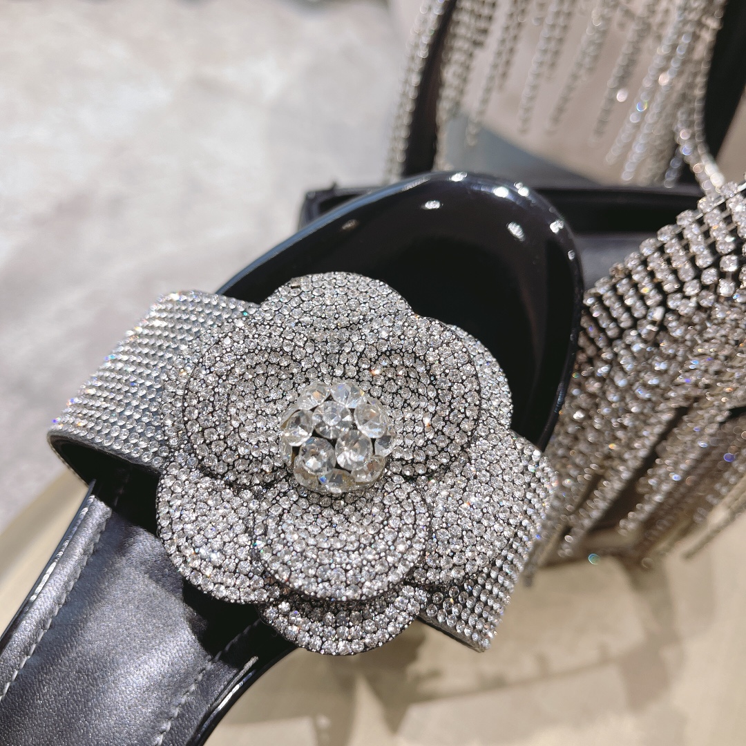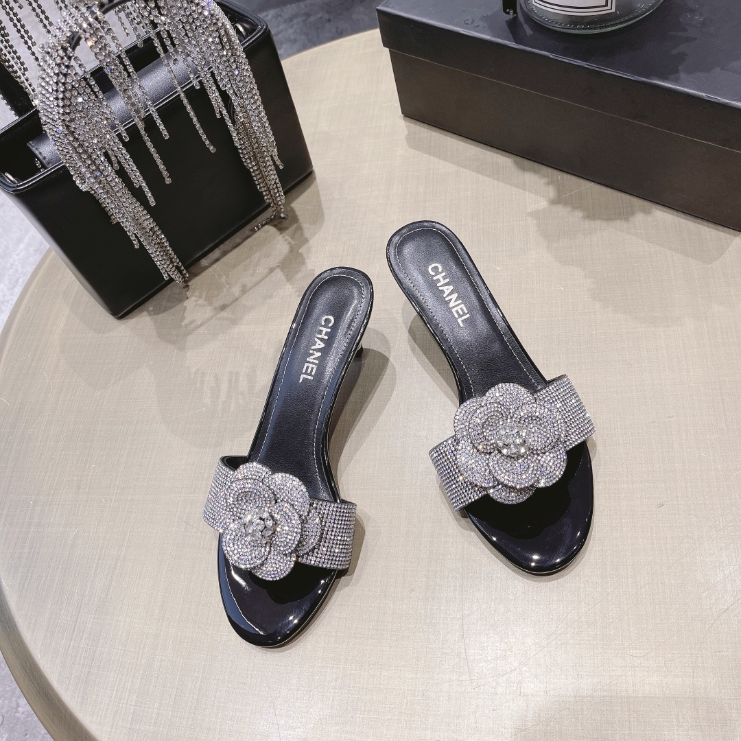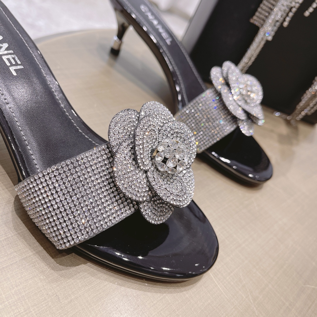 I5 Chanel 香奈儿凉拖鞋,面料真丝+烫钻配顶级A钻茶花🌸 ,羊皮内里,垫脚进口山羊皮,橡胶底34一39码,高跟8㎝,矮跟5㎝两种选择