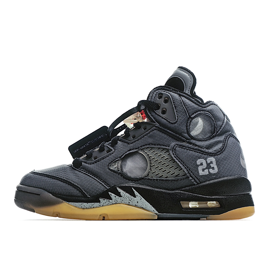 Air Jordan DT纯原AJ5原价4xx版 现 Off-White x Air Jordan 5 Retro SP 黑蝉翼采用原厂韩国进口TPU网纱原面质感 色泽 纹路 同步公司原鞋全面电脑针车 原档案精准数据打造外内侧进口KPU网格软材料 字母精准对位 原厂PU+RB大底 正确喷漆泼墨图案 独家原装大底 正确 立体侧标正确中底钢印