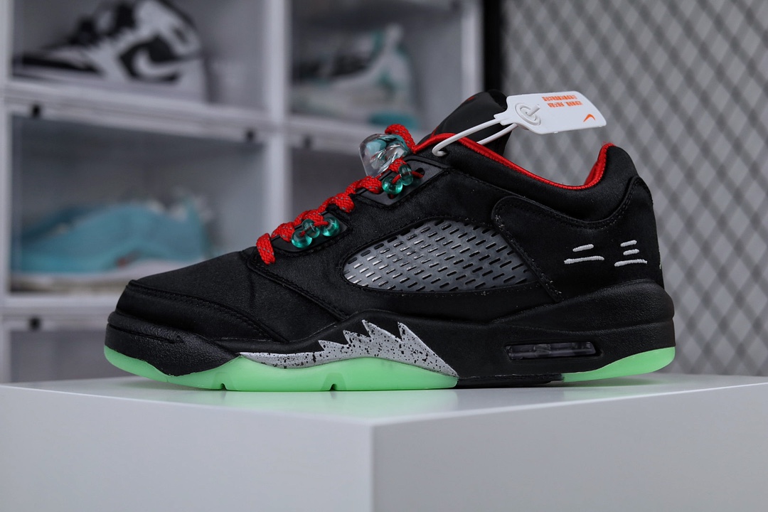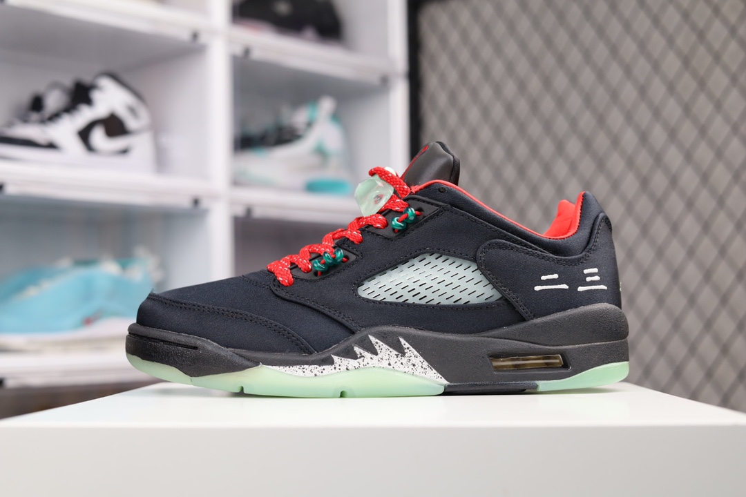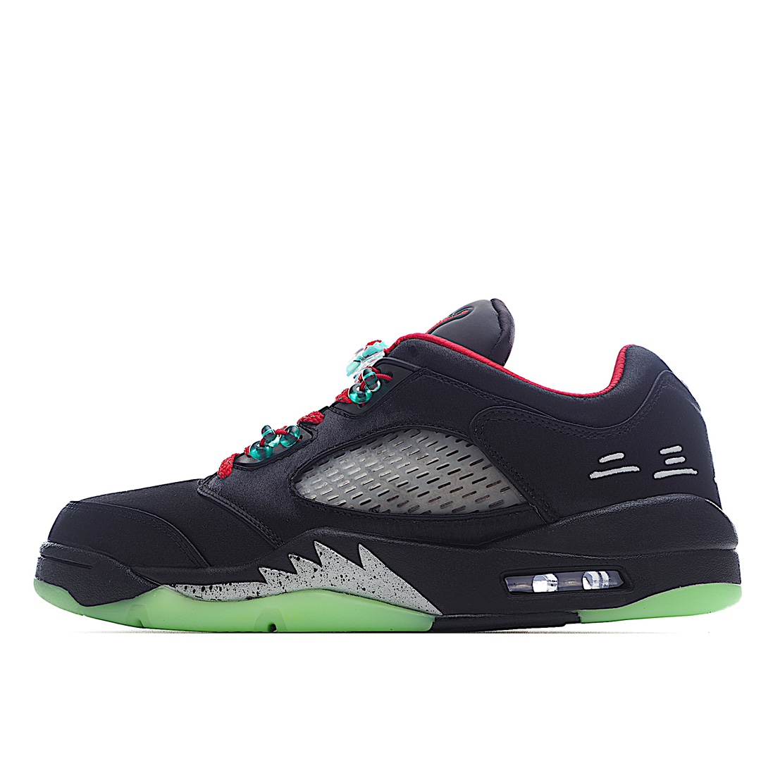 Air Jordan I5 Clot × Air Jordan Retro 5 重磅联名 乔丹AJ5代低帮复古休闲文化篮球鞋 黑红绿 夜光大底眼前这款Air Jordan 5 鞋周身以翻毛皮革材质的鞋面,搭配深黑色鞋舌及中底,银色 Jumpman Logo及鲨鱼牙点缀,整体风格 酷劲十足