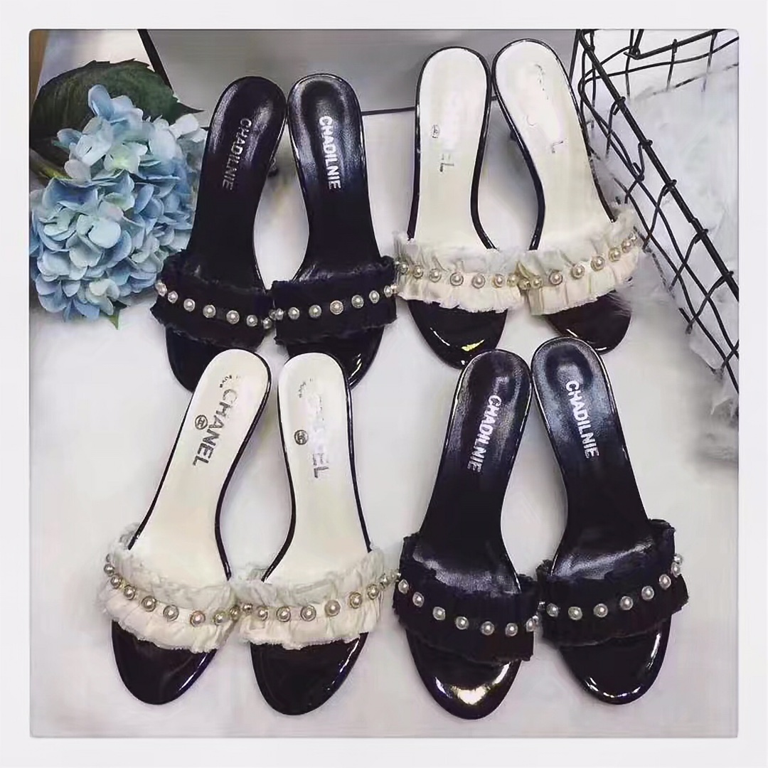 Chanel I0 、 Chanel 香奈儿凉拖鞋 鞋面压花蕾丝配精致蝴蝶结开模鞋跟羊皮内里 垫脚进口山羊皮 ,女人味十足鞋城订单款,做工精细橡胶底34-39,以出货,欢迎拿版实体进货2种跟高一个7CM、一个5CM